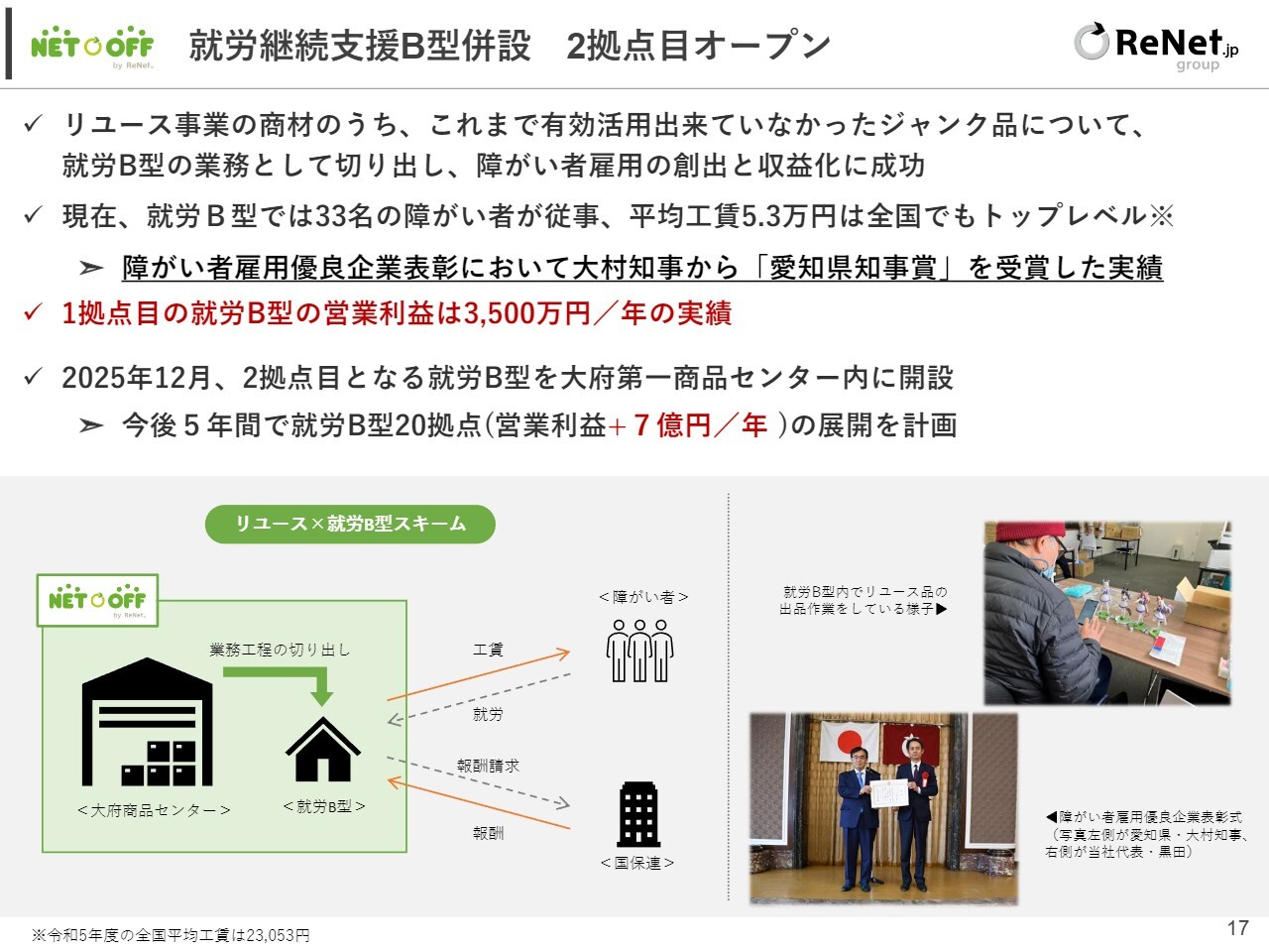リユース事業のトピックスです。リユース事業に併設するかたちで、障がい者の就労継続支援B型の2拠点目がオープンしました。リユース事業の商材のうち、ホビー&フィギュアにおいて有効活用できていないジャンク品がありましたが、これを就労継続支援B型の業務として切り出すことで、障がい者雇用の創出と収益化に成功しました。