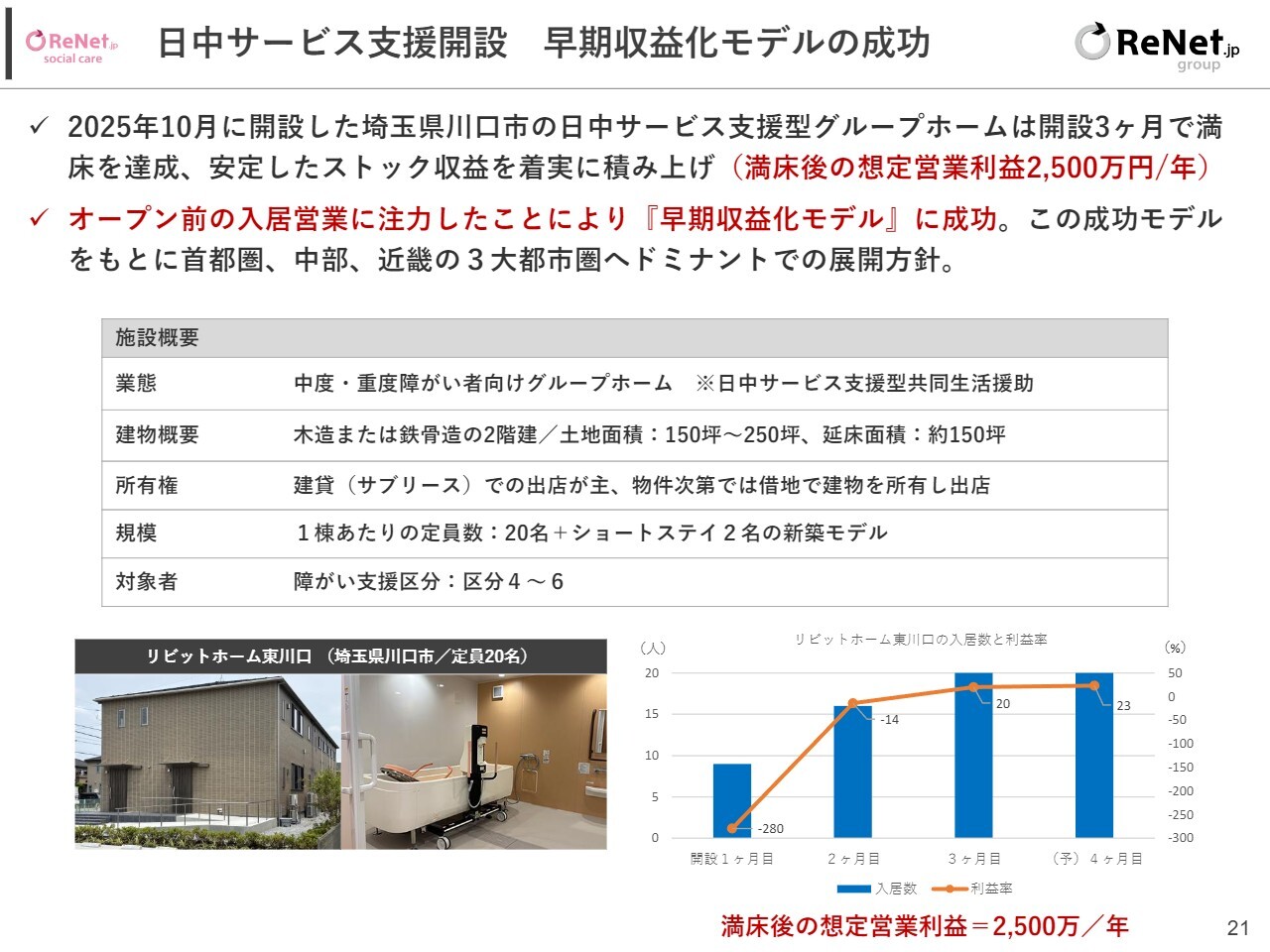 ソーシャルケア事業のトピックスとして、これから力を入れていく日中サービス支援型グループホームについてご説明します。これは、中度から重度の障がいをお持ちの方を対象に、新築で立ち上げるモデルです。昨年10月に埼玉県川口市で新たにオープンし、3ヶ月で満床を達成しました。今後も安定したストック型収益を着実に積み上げていきたいと考えています。