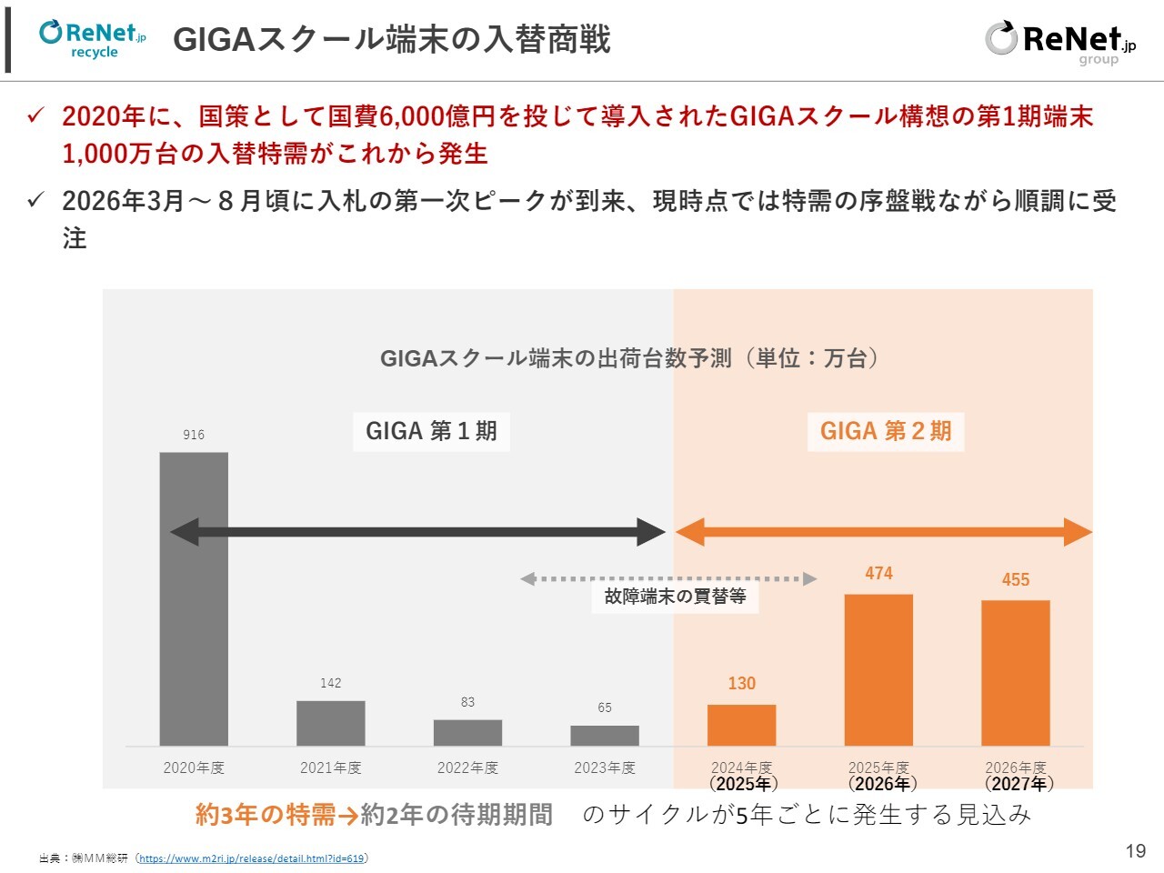 これは、現在、リサイクル事業において小・中学校向けに1人1台端末が導入されたGIGA端末の入替による特需が発生しているためです。初めての商戦ということもあり、期首計画は保守的に設定されていましたが、入札が進み営業の手応えが見えてきたことから、確度の高い案件を一部通期予想に織り込みました。