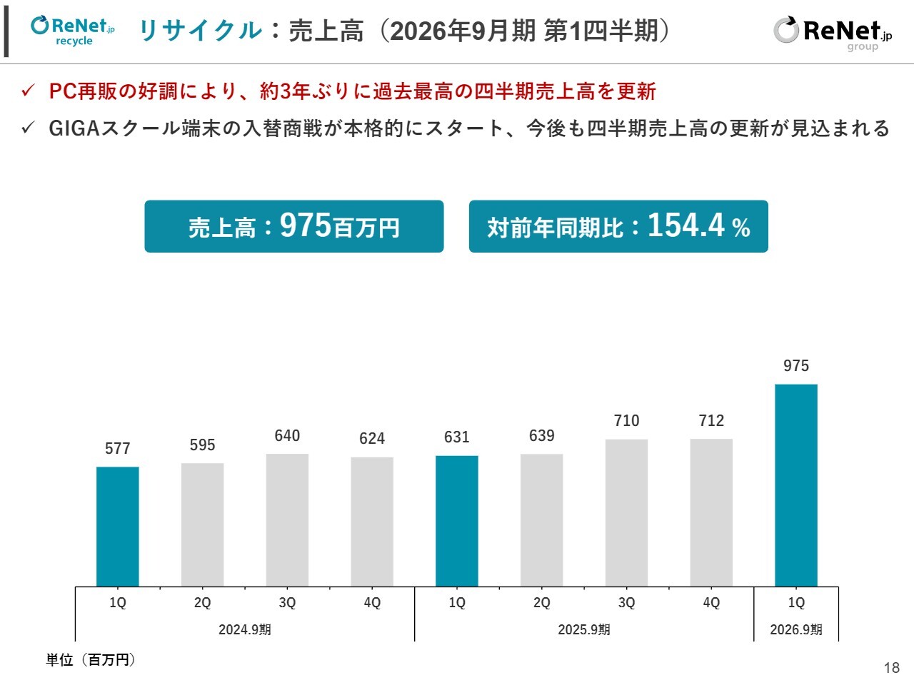 リサイクル事業の売上高は9億7,500万円で、前年同期比154.4パーセントとなりました。GIGA端末商戦の影響が一部みられますが、既存のBtoC回収事業が非常に伸びており、好調に推移しています。