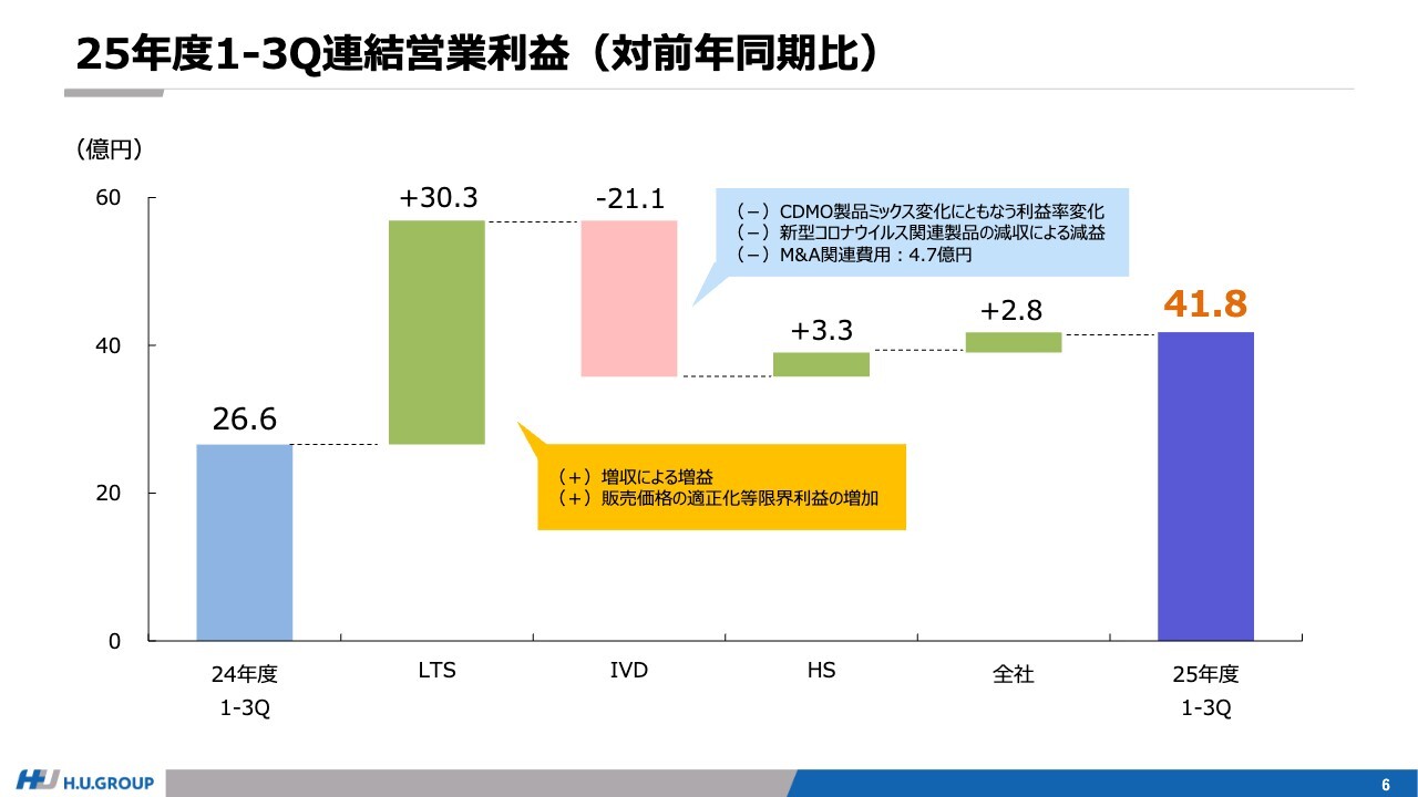 IVD事業が減益となった大きな要因は、CDMOのミックス変化による影響、新型コロナウイルス関連売上の減収による減益、M&A関連コストです。