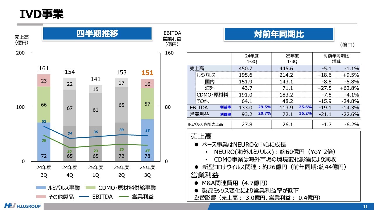 IVD事業では、NEUROの成長と利益貢献があるものの、CDMOの既存製品における海外市場の環境変化を背景に、当社の製品ミックスが当初の想定から変化した結果、利益率が想定を下回って推移しています。このミックス変化の詳細については、後ほどご説明します。