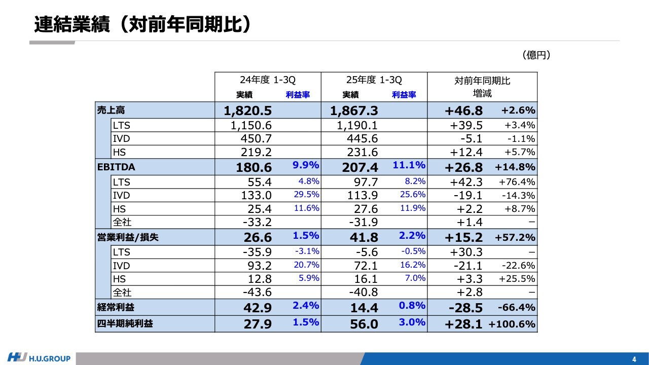あらためて業績についてご説明します。前年同期比で増収増益は継続していますが、セグメントによって濃淡が出ています。