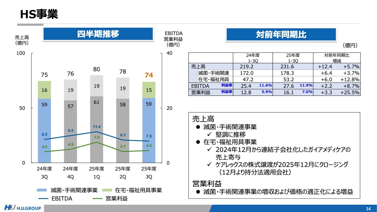 HS事業です。滅菌・手術関連事業は堅調に推移し、売上高は増収となりました。また、在宅事業では、2024年12月から連結子会社化しているガイアメディケアの売上高が、増収に寄与しています。