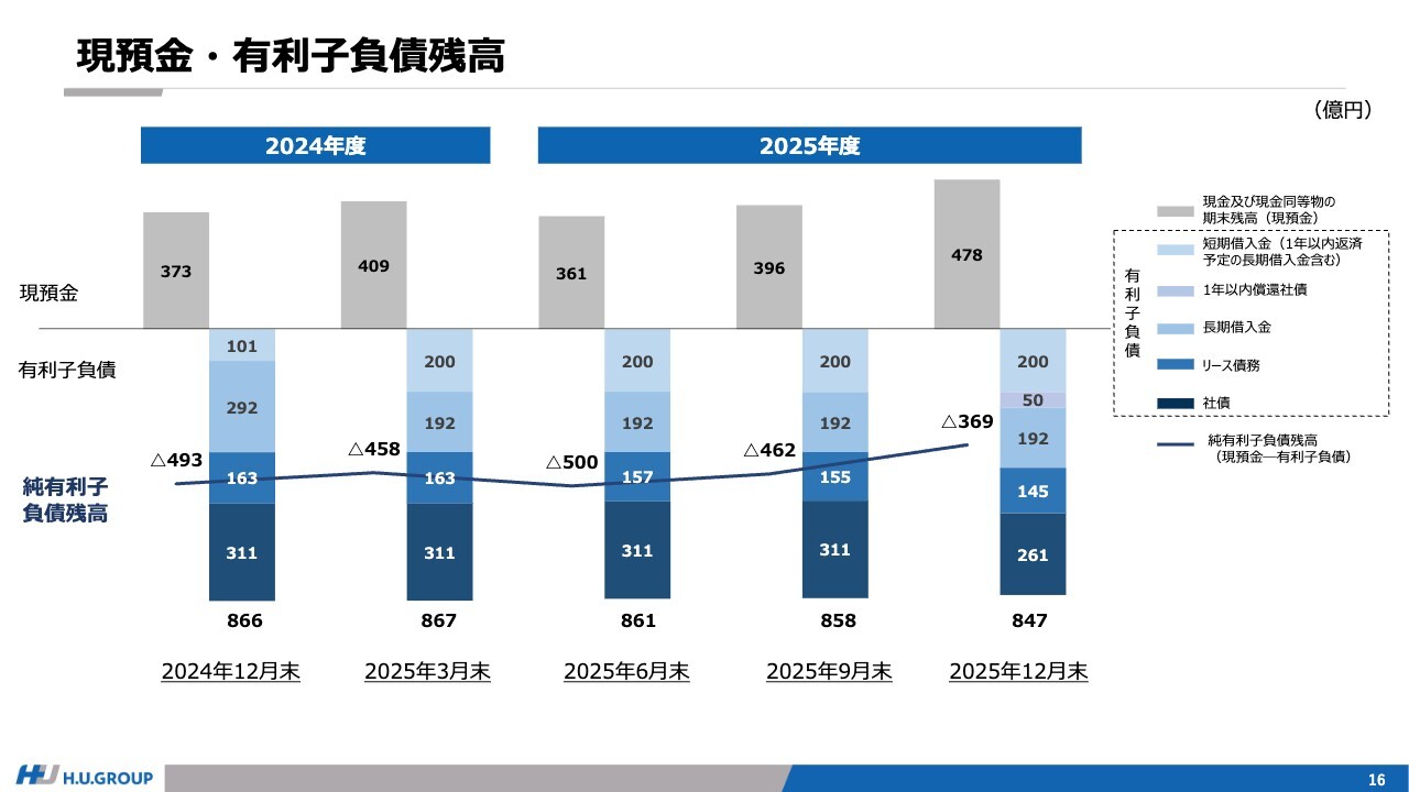 現預金・有利子負債残高です。有利子負債の水準は大きく変わっていませんが、フリー・キャッシュ・フローの大幅な増加によって現預金が積み上がった結果、純有利子負債は減少しています。