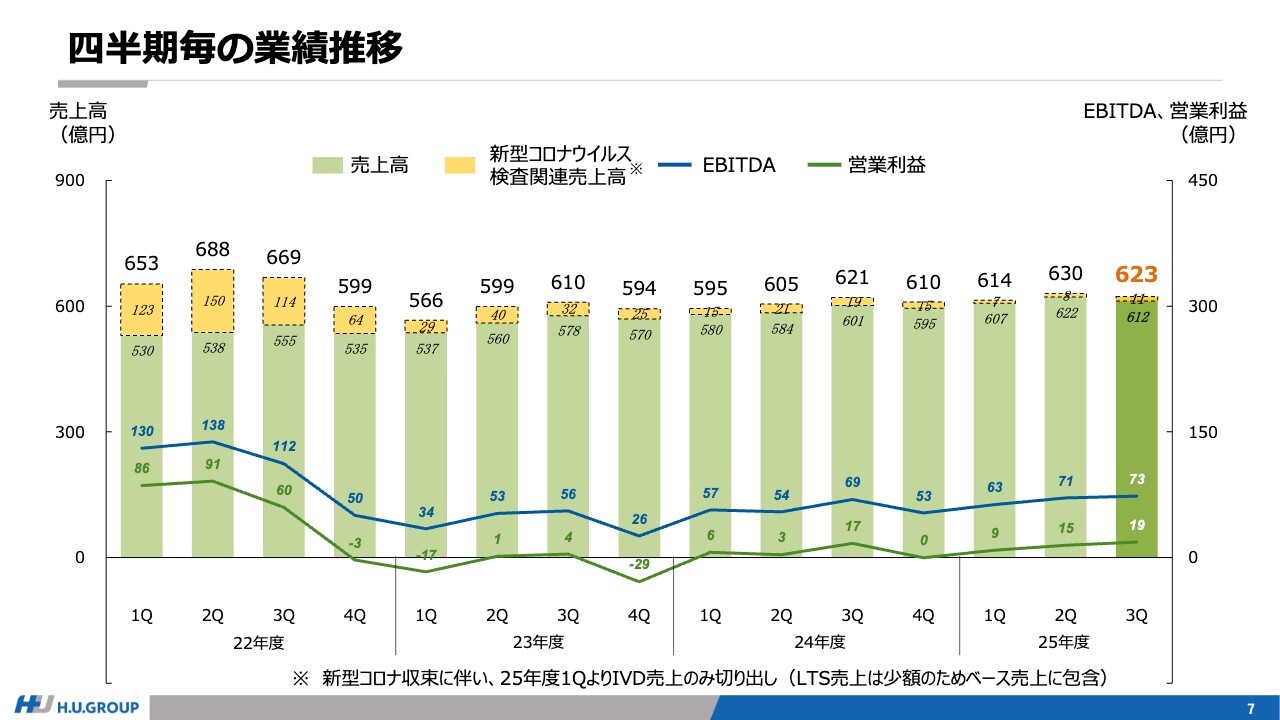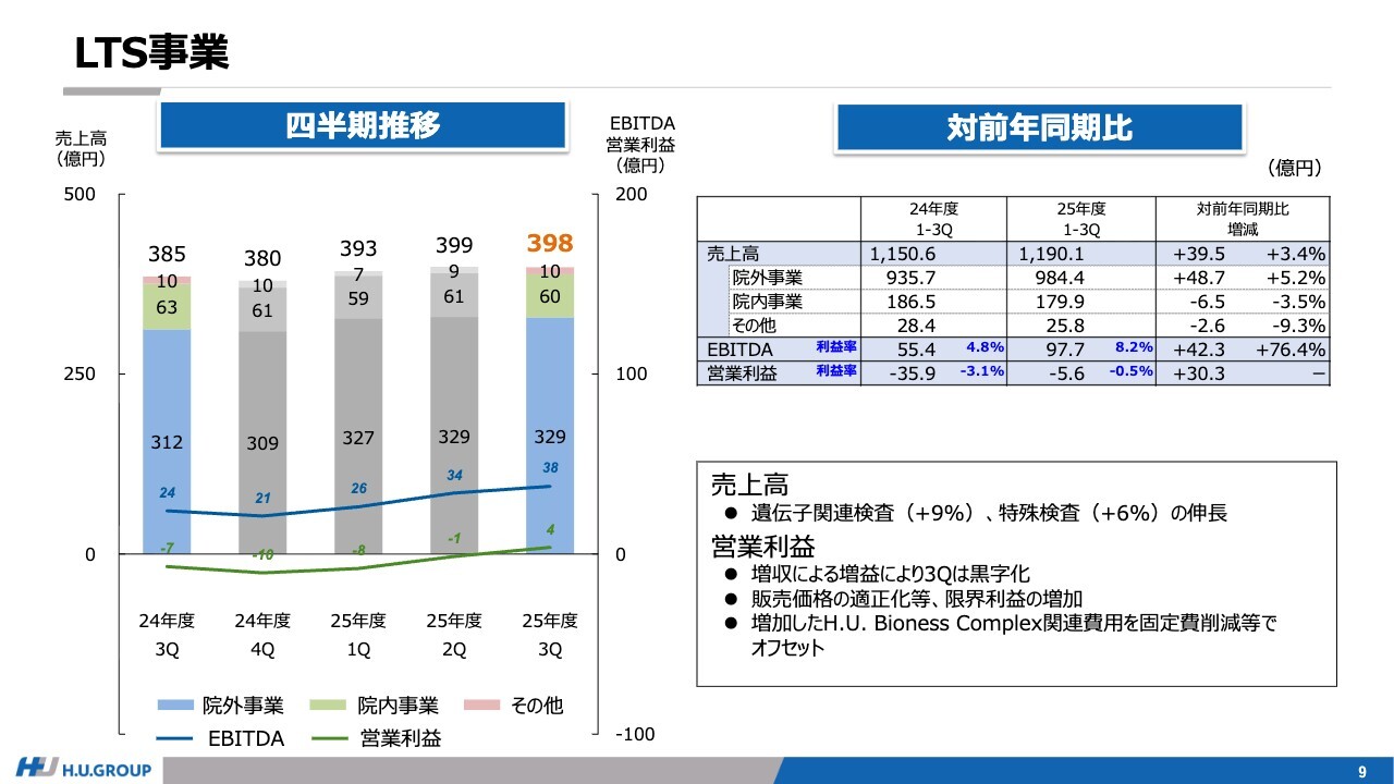 セグメント別では、LTS事業は、継続的な遺伝子関連および特殊検査の成長、さらに販売価格の見直しにより、限界利益が増加しています。また、固定費削減施策の効果も、徐々に現れてきています。その結果、第3四半期の営業利益は、3年ぶりに黒字へと転換しました。