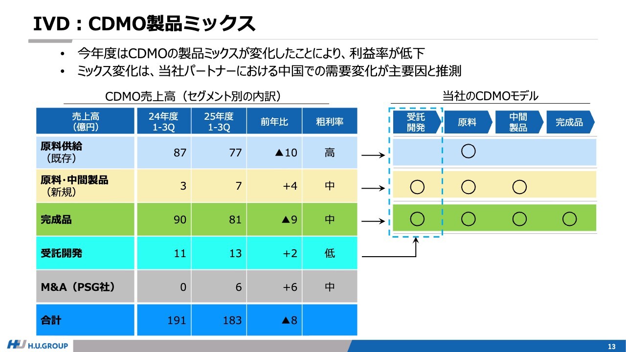 繰り返しになりますが、今年度は、CDMOの製品ミックスの変化により、利益率が低下しています。これは、当社パートナーにおける中国での需要変化が要因だと考えています。これにより、当社の製品ミックスが変化しました。