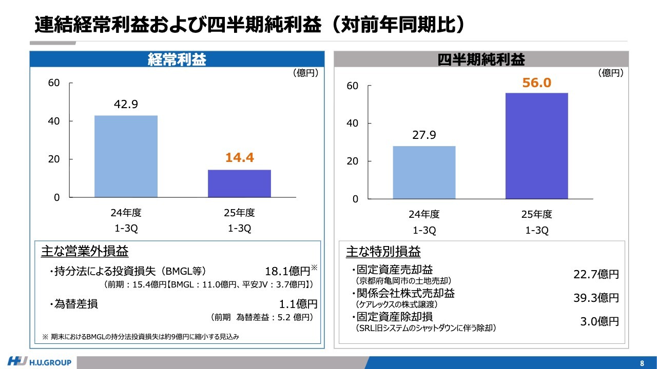 スライド左側の経常利益については、営業外損益として計上している持分法による投資損失は現時点で約18億円となっています。これは会計上の一時的なものであり、期末における持分法の投資損失は約9億円レベルに縮小する見込みです。