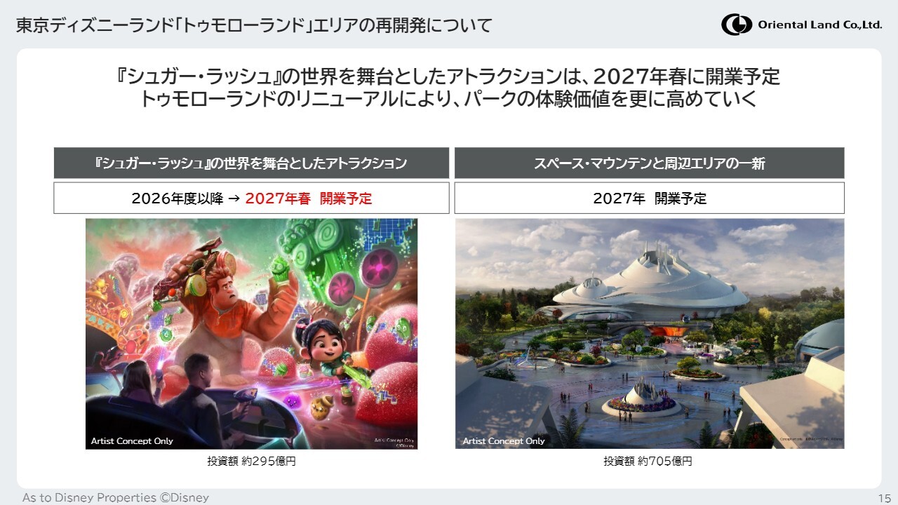 『シュガー・ラッシュ』の世界を舞台としたアトラクションが、2027年春に開業する見通しとなりました。同年には、同じエリアでスペース・マウンテンの開業と周辺エリアの一新により、東京ディズニーランドの「トゥモローランド」エリアが大幅に刷新され、まったく新しい体験をお届けできる予定です。どうぞご期待ください。