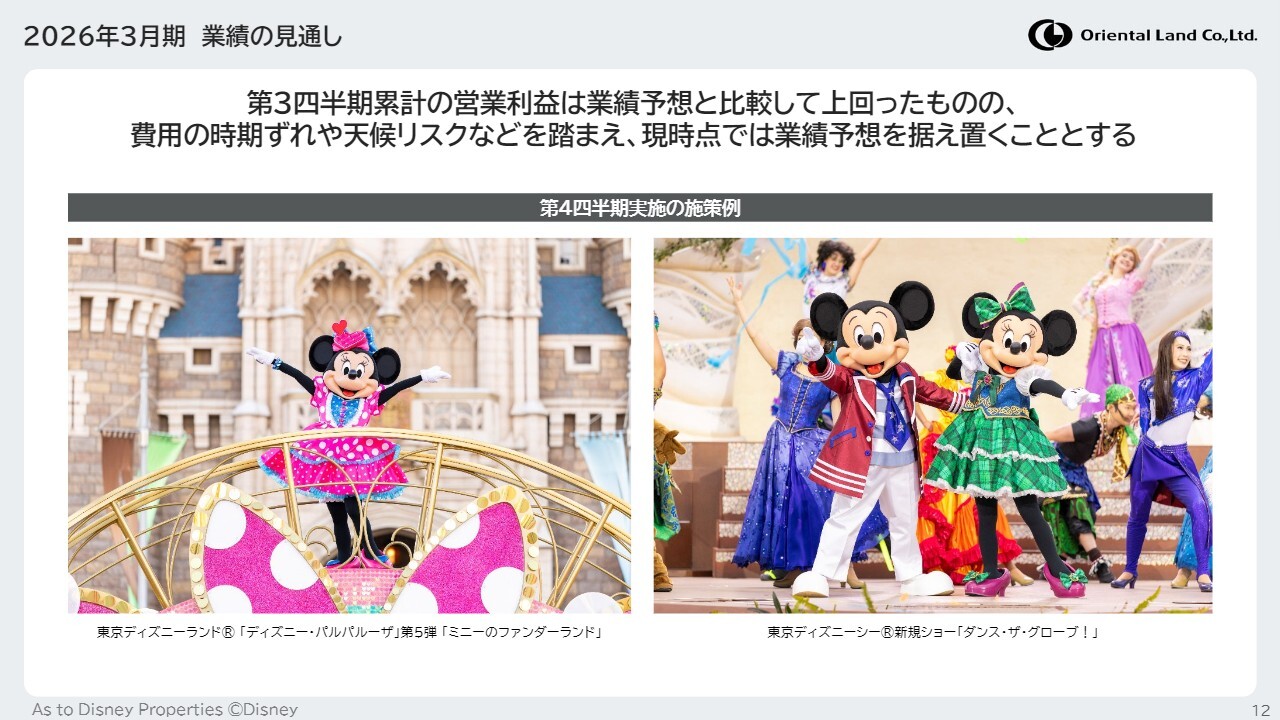 1月14日からディズニー・パルパルーザの「ミニーのファンダーランド」や東京ディズニーシーの新たなエンターテイメントである「ダンス・ザ・グローブ!」を開始しており、ゲストからご好評をいただいています。施策を着実に実施するとともに、コストコントロールを継続し、引き続き業績向上に努めていきます。