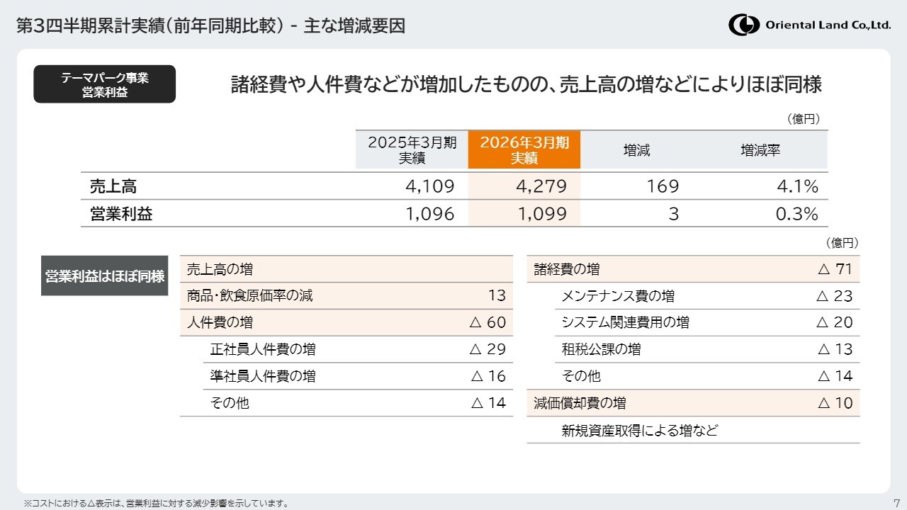 人件費は、賃金改定や人数増などにより増加しました。諸経費では、ファンタジースプリングスに関連するメンテナンス費の増加や、IT機器の入れ替えに伴うシステム関連費用の増などにより増加しました。