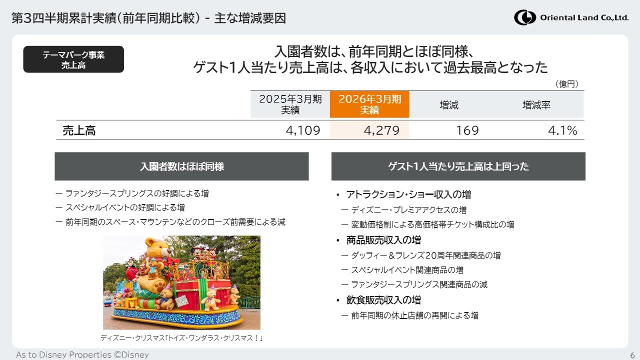セグメント別の実績と増減要因についてご説明します。テーマパーク事業の売上高は169億円増の、4,279億円となりました。入園者数は前年同期とほぼ同様の水準でした。前年同期にはスペース・マウンテンなどのクローズ前需要があったものの、当期はファンタジースプリングスやスペシャルイベントが好調に推移しました。
