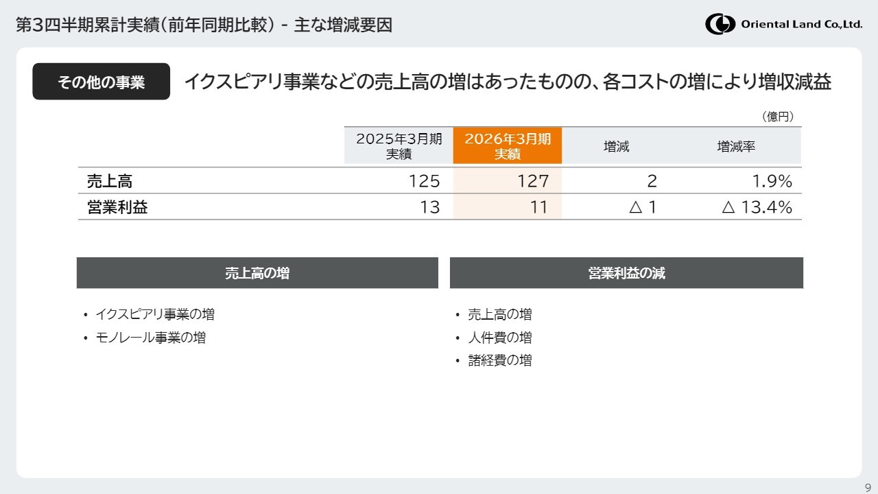 テーマパーク事業の営業利益は3億円増加し、1,099億円となりました。商品・飲食原価率は、飲食原価率がセントラルキッチンの再開に伴う製造経費率の増などにより増加したものの、商品原価率が売上構成の変化による使用原価率の減などにより減少し、全体として減少しました。