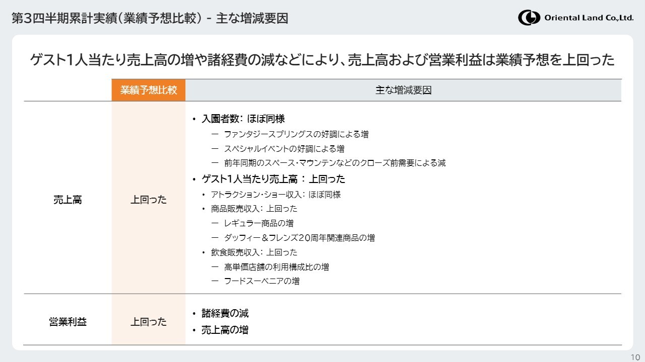 業績予想と比較すると、ゲスト1人当たり売上高の増や諸経費の減などにより、売上高・営業利益ともに業績予想を上回りました。入園者数は、前年同期のスペース・マウンテンなどのクローズ前需要による減があったものの、ファンタジースプリングスやスペシャルイベントの好調などにより、ほぼ同様となりました。