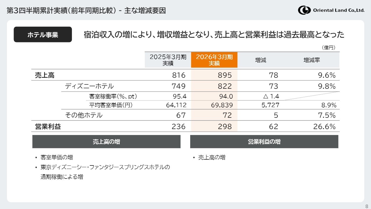 ホテル事業では、東京ディズニーシー・ファンタジースプリングスホテルの客室単価の増や通期稼働の影響で、売上高が78億円増加し、895億円となりました。