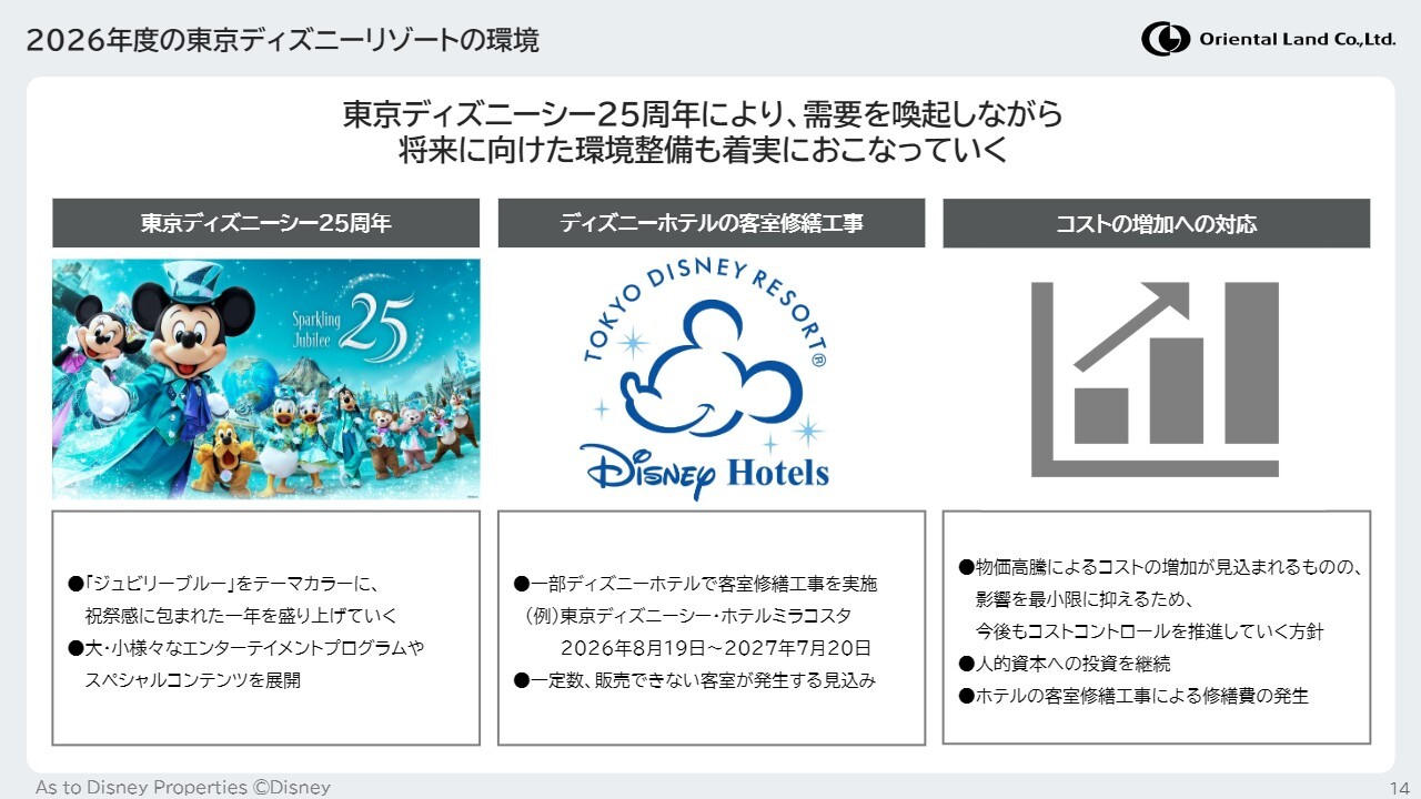 今後の見通しをご説明します。2026年度の予算は、現在精査中ですが、来期の東京ディズニーリゾートの環境を十分に考慮して策定する予定です。そのため、現時点で見えている業績に影響を与えうる要素についてお話しします。