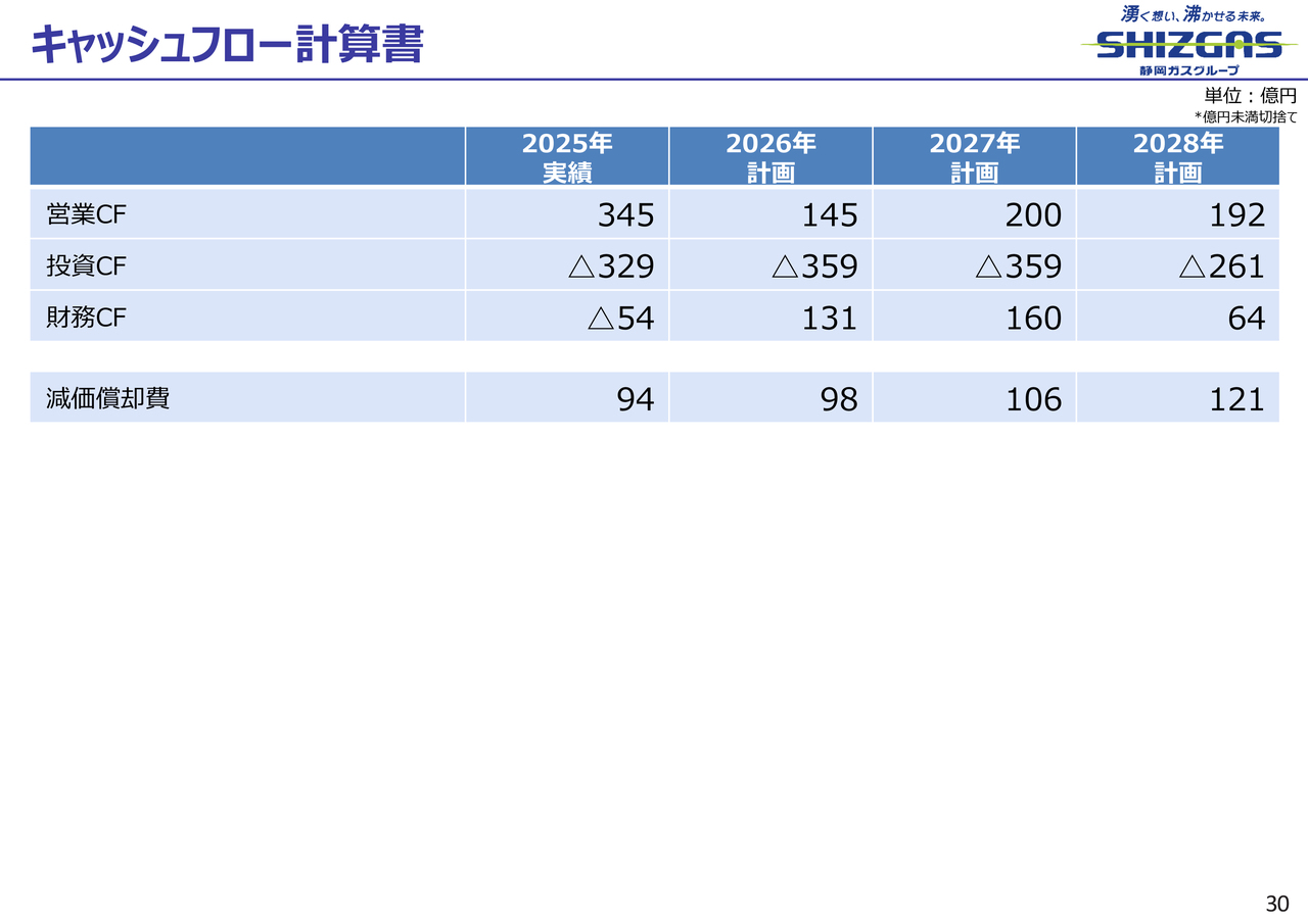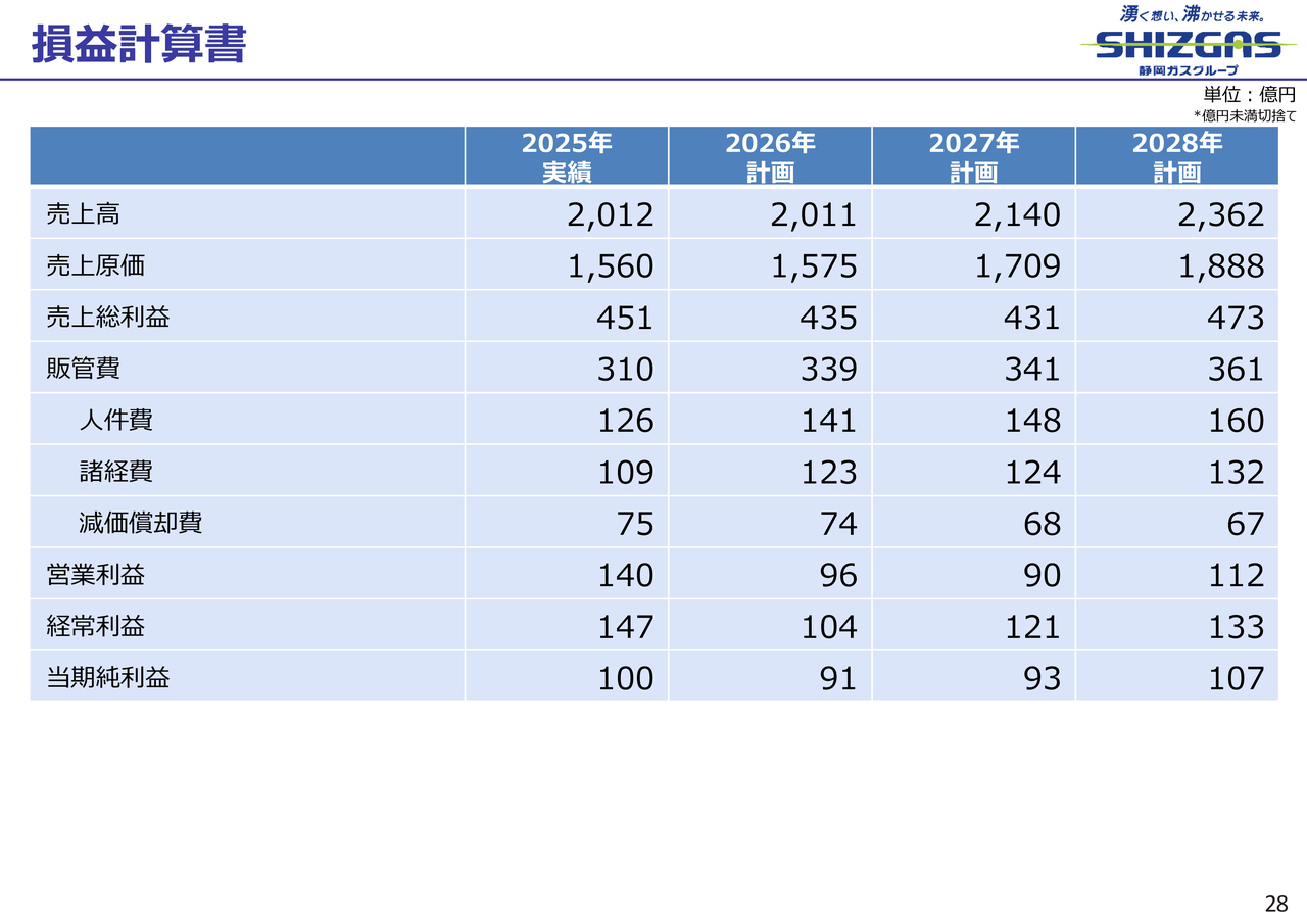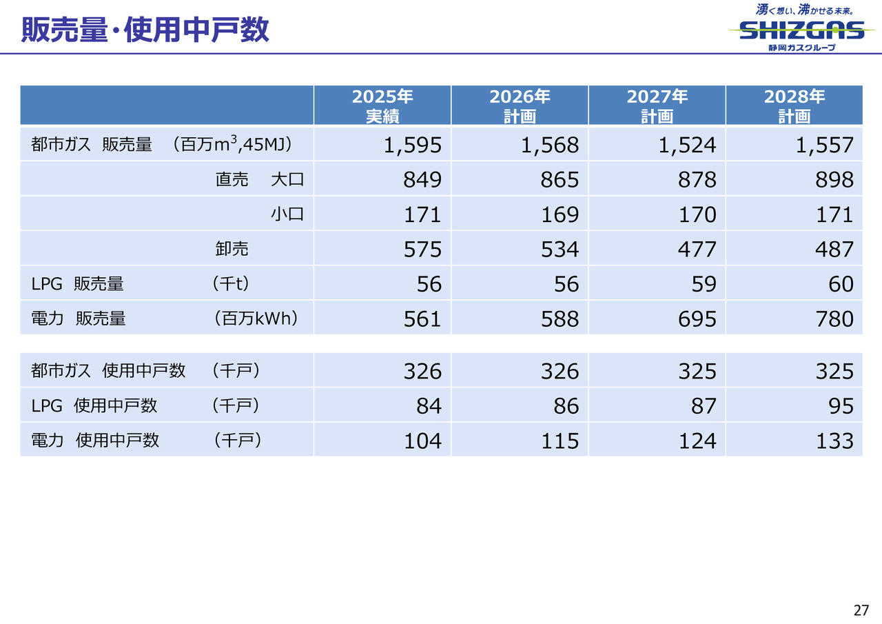 都市ガスの販売量は、2025年は15億9,500万立方メートルで、2026年以降は15億6,800万立方メートル、15億2,400万立方メートル、15億5,700万立方メートルと、2027年にかけて減少し、2028年に増加する計画です。