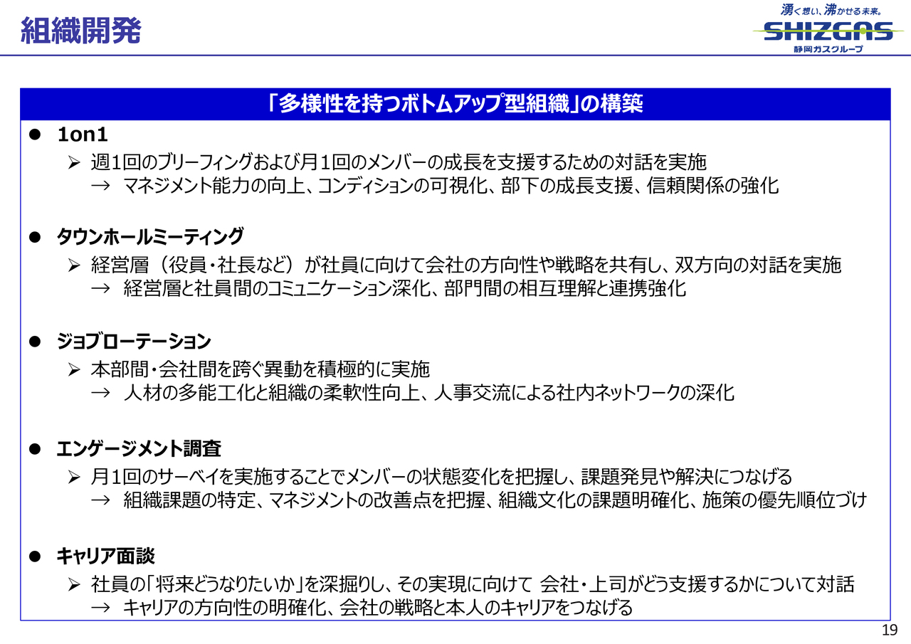 この取り組みは、数値の向上が目的ではなく、その結果、若手社員の離職を減らすことを目指しています。例えば、以前は若手社員が「静岡ガスグループでは成長できないから」という理由での退職が多い状況でしたが、最近ではそのような理由で退職する社員はほとんどいなくなりました。