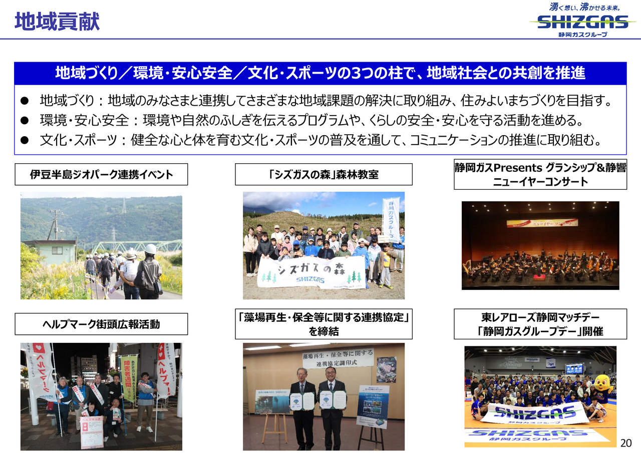 地域貢献には、「地域づくり」「環境・安心安全」「文化・スポーツ」の3つを柱に、引き続き取り組んでいきます。また、会社として取り組むだけではなく、グループの社員が個人的に地域貢献に取り組むマインドの醸成を進めていきます。