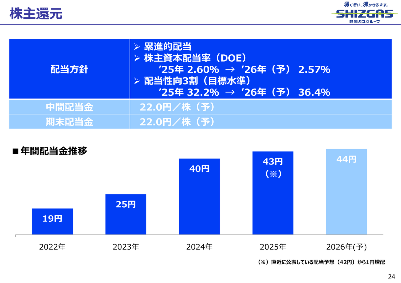 次に年間配当金です。昨年の本決算時には41円で、2025年は一過性要因が中心ではありますが、会計上の利益が大きく上振れしたことを踏まえ、年間配当金を2円増配し、43円としました。この時のDOEは2.6パーセント、配当性向は32.2パーセントで、ほぼ前年並みとなる予定です。