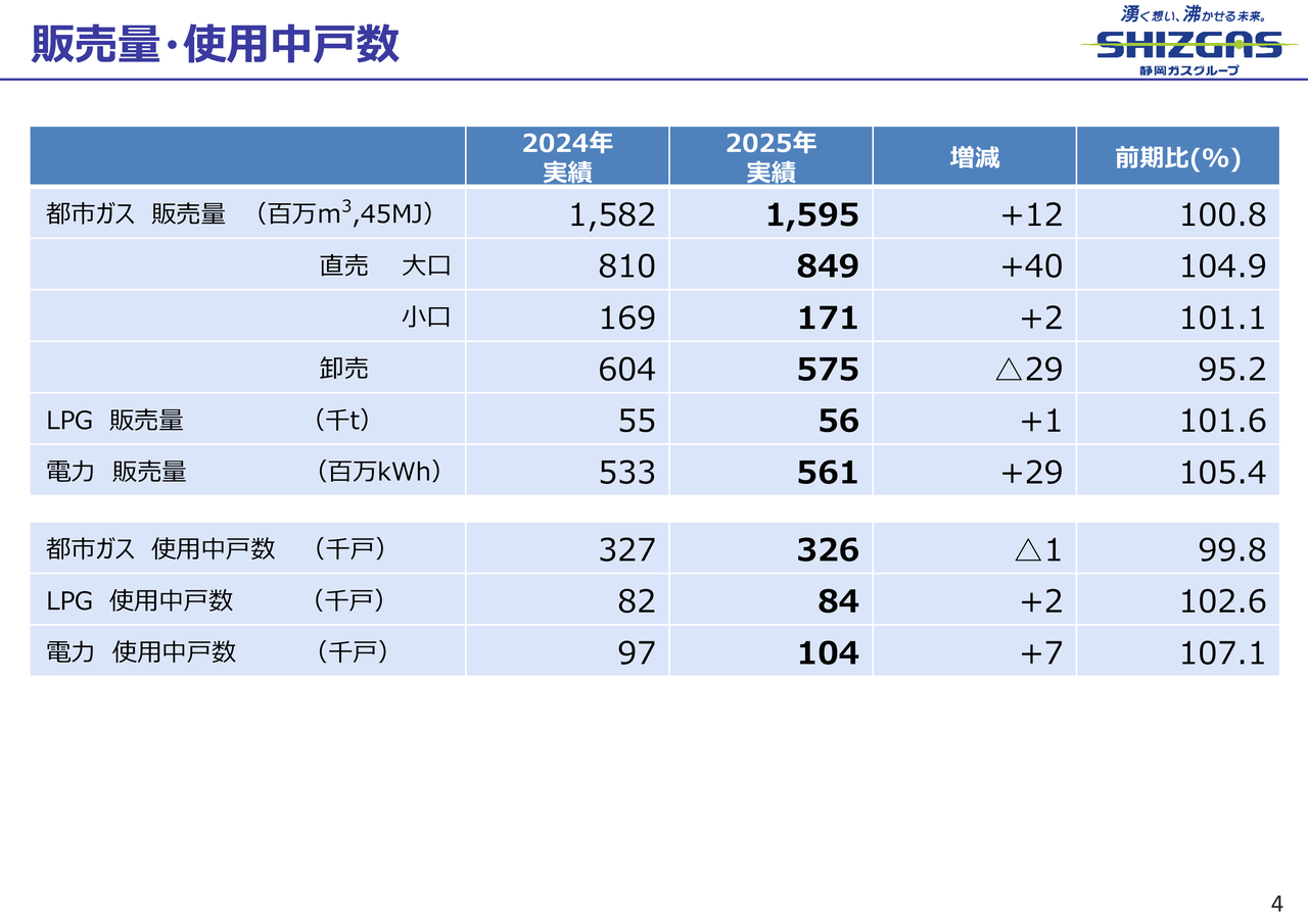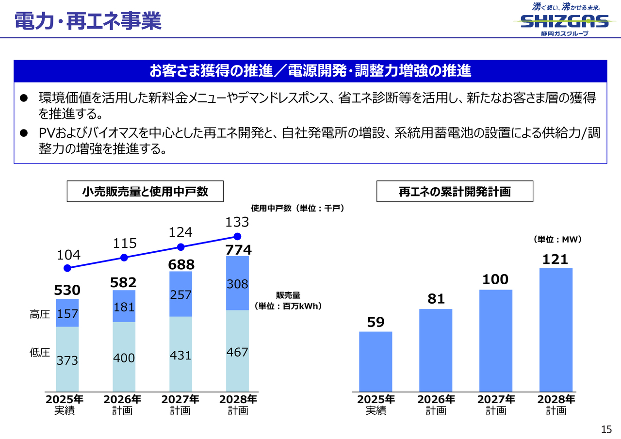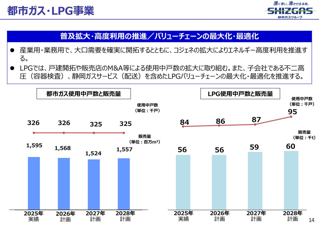 一方、グループ会社でまだ潜在需要が残っているエリアや、静岡ガスにおいても、導管延伸を伴うエリアの開拓を進めることで、都市ガスの使用中戸数を横ばいで維持したいと考えています。