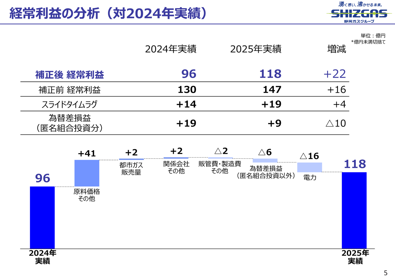 これに補正項目として、スライドタイムラグと匿名組合投資に係る為替差損益の前期比マイナス5億円となる28億円を加算した結果、補正前連結経常利益(会計上の連結経常利益)は前期比プラス16億円の147億円となりました。補正前当期純利益は前期比プラス12億円の100億円です。