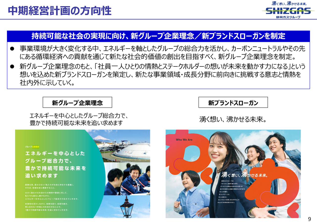 新グループ企業理念は「エネルギーを中心としたグループ総合力で、豊かで持続可能な未来を追い求めます」、新ブランドスローガンは「湧く想い、沸かせる未来。」です。