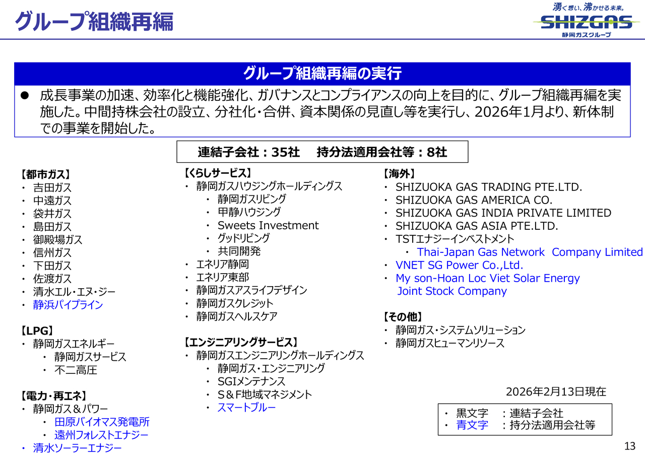 事業領域を拡大し、さらに成長とガバナンスを両立させるため、2026年1月にグループの組織を大規模に再編しました。この再編により、連結子会社35社、持分法適用会社など8社、そして静岡ガスの計44社の企業群で事業を推進していきます。(企業数は2026年2月13日時点)