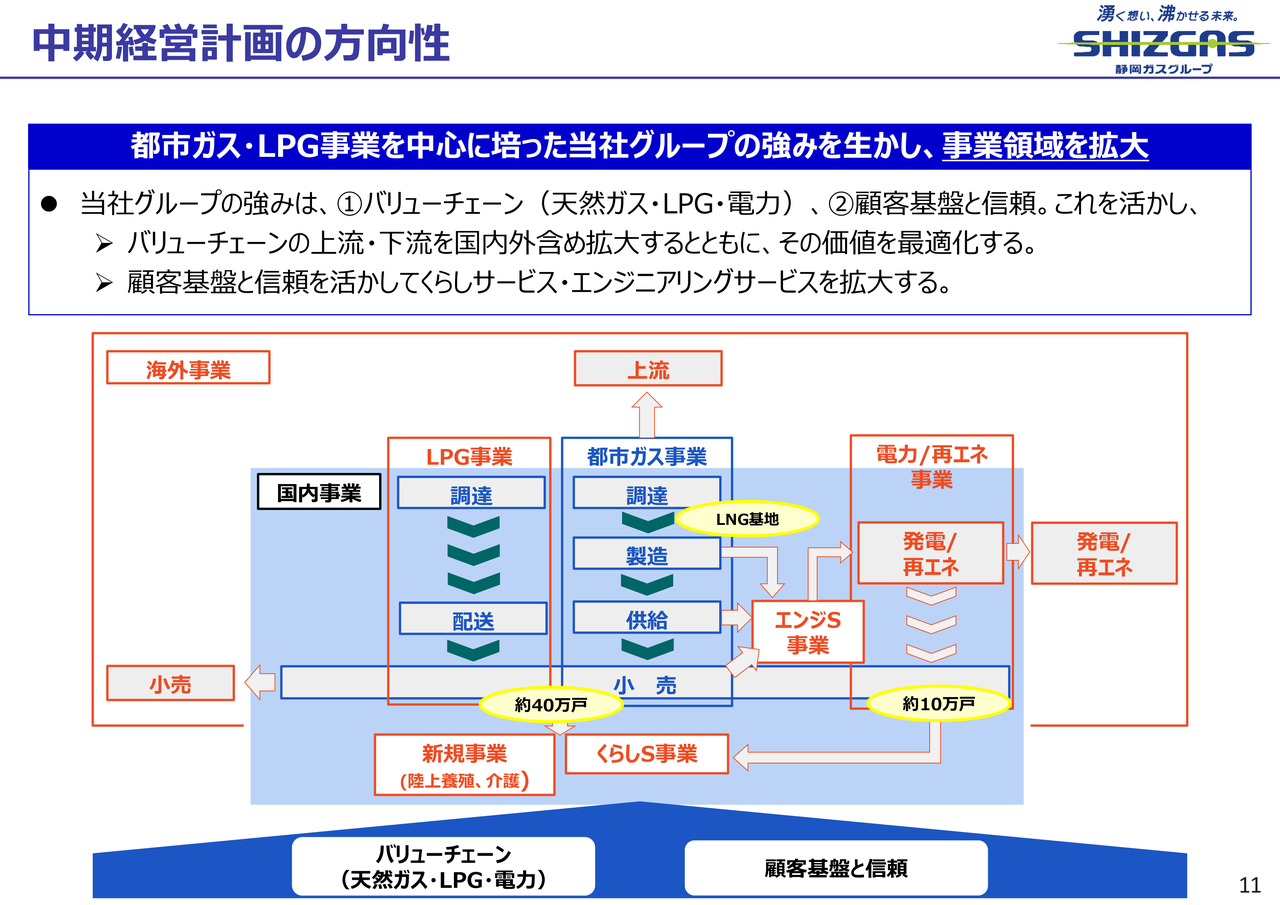 前者では、上流開発や液化事業への参入、後者ではガス配給事業や再生可能エネルギーの開発に取り組んでいきます。