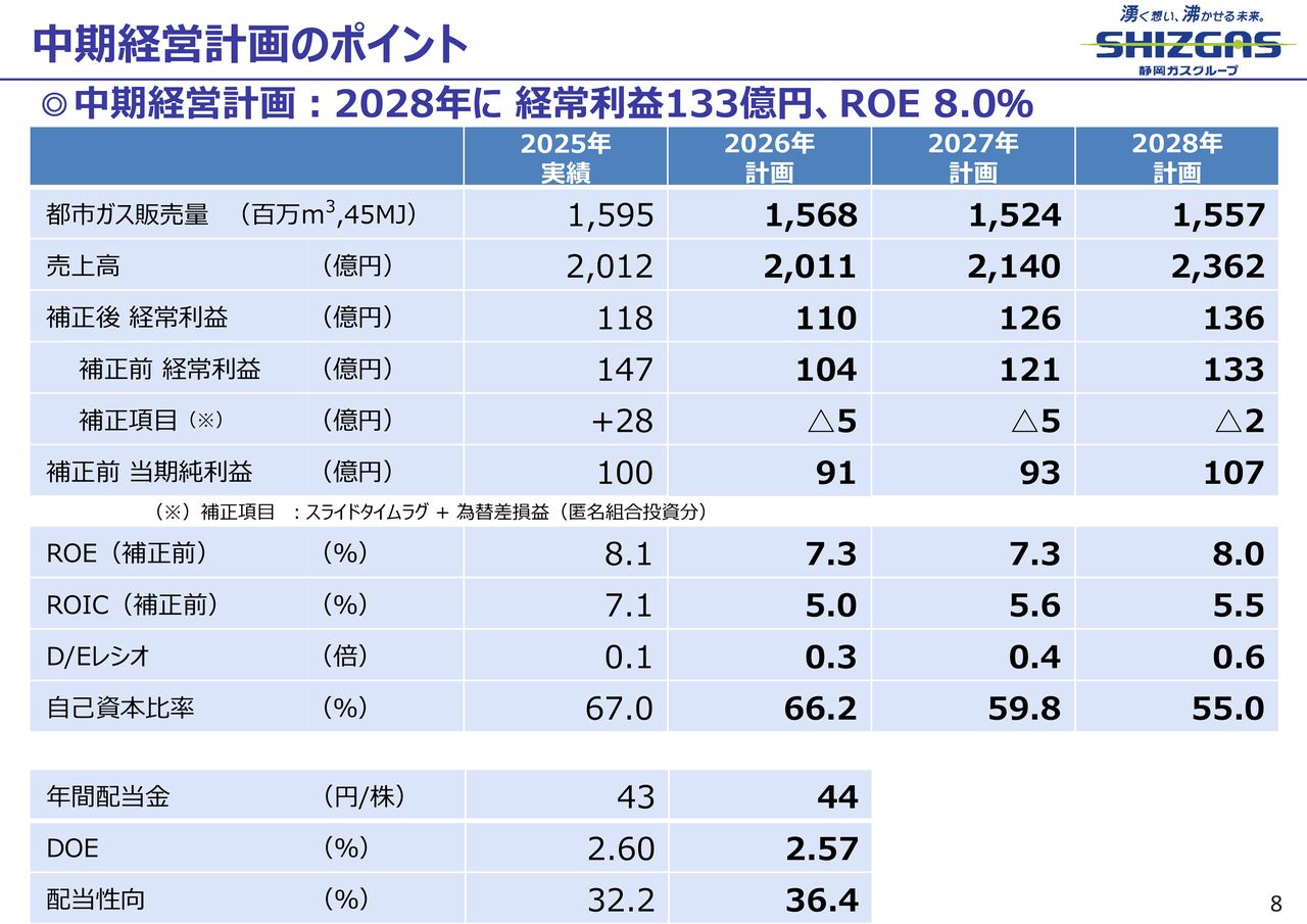 1つ目のポイントは「グループ2030年ビジョン」で掲げた、2030年における連結経常利益130億円、ROE8パーセントという目標を2年前倒しし、2028年に達成させることです。