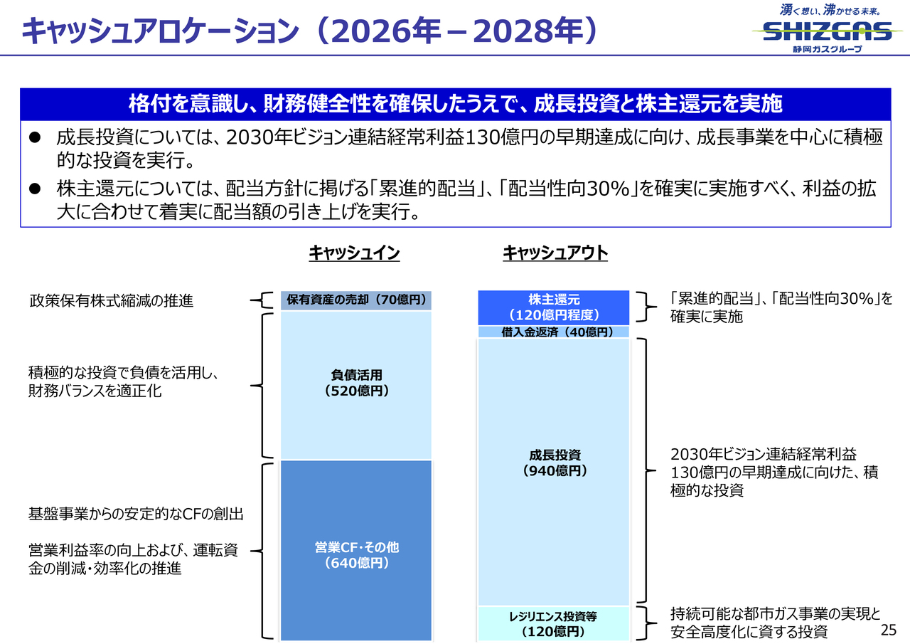先ほど成長投資およびレジリエンス投資についてお話ししましたが、成長投資には940億円、レジリエンス投資には120億円、合計で1,070億円を投資していきます。加えて、借入金の返済が40億円、および株主還元として120億円程度を充当する予定です。