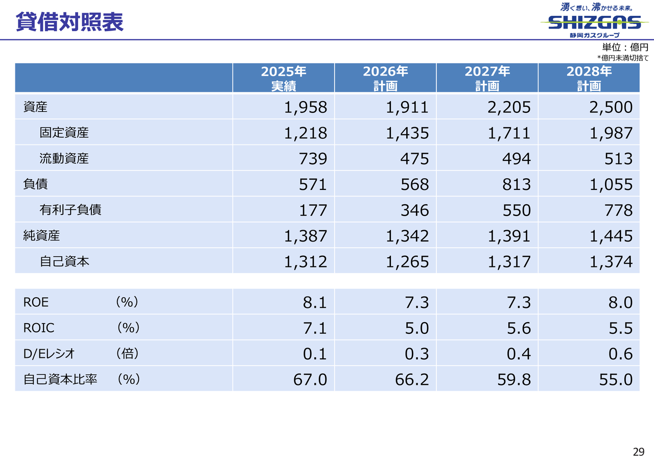 なお、2025年は実績値を、2026年から2028年は計画値を記載しています。その結果、バランスシートにおいて2025年と2026年で整合していない箇所がありますので、あらかじめご了承ください。