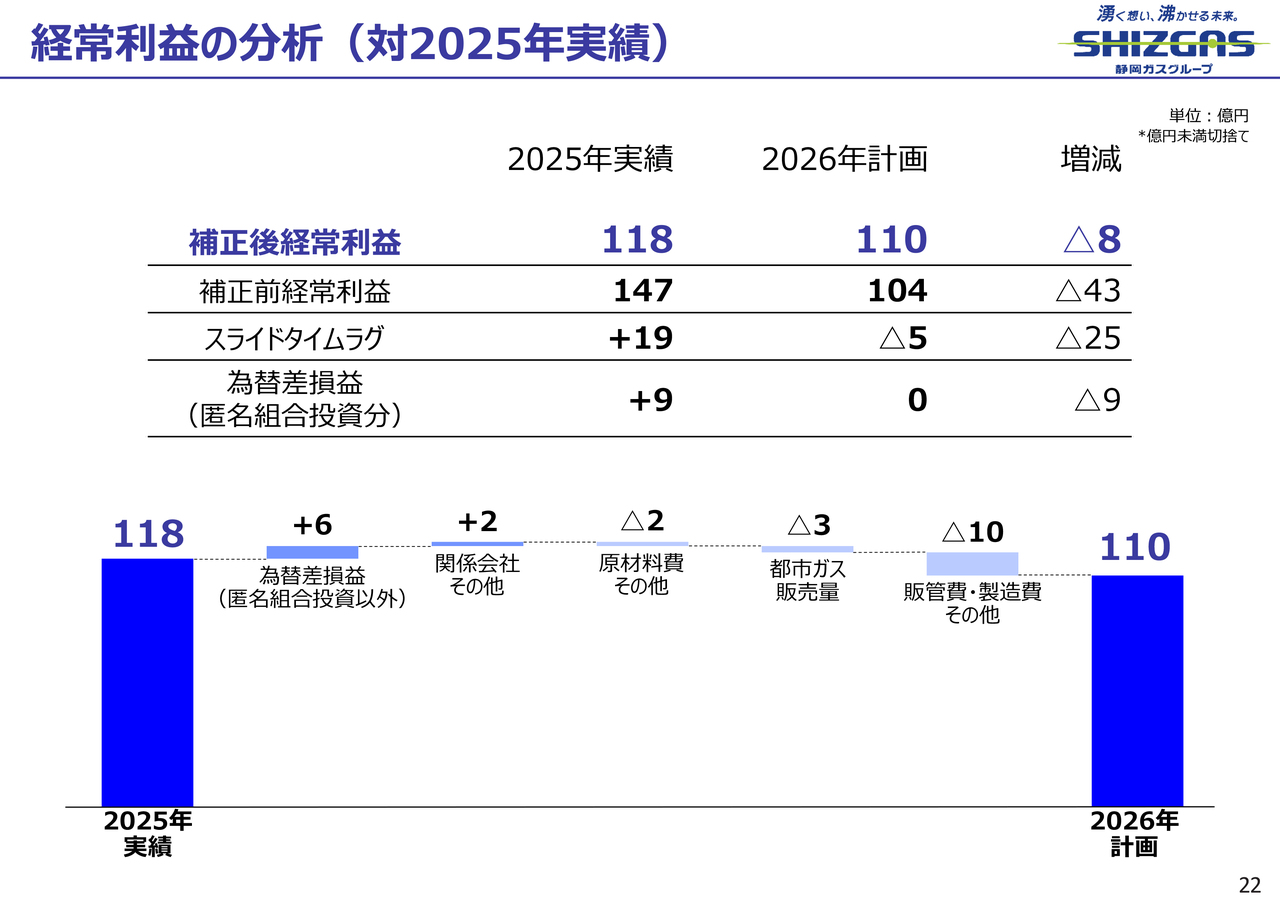 原材料費その他は、2026年には2025年に見られたCIF差による増益影響が圧縮されると予測しています。一方で、2025年に比べ、2026年は原油価格が下がることから、LNGの価格全体が下落し、CIF差への影響も小さくなると考えています。また、静岡ガスとしても、調達価格を下げる努力を行い、この差を前期比でマイナス2億円に抑える見込みです。