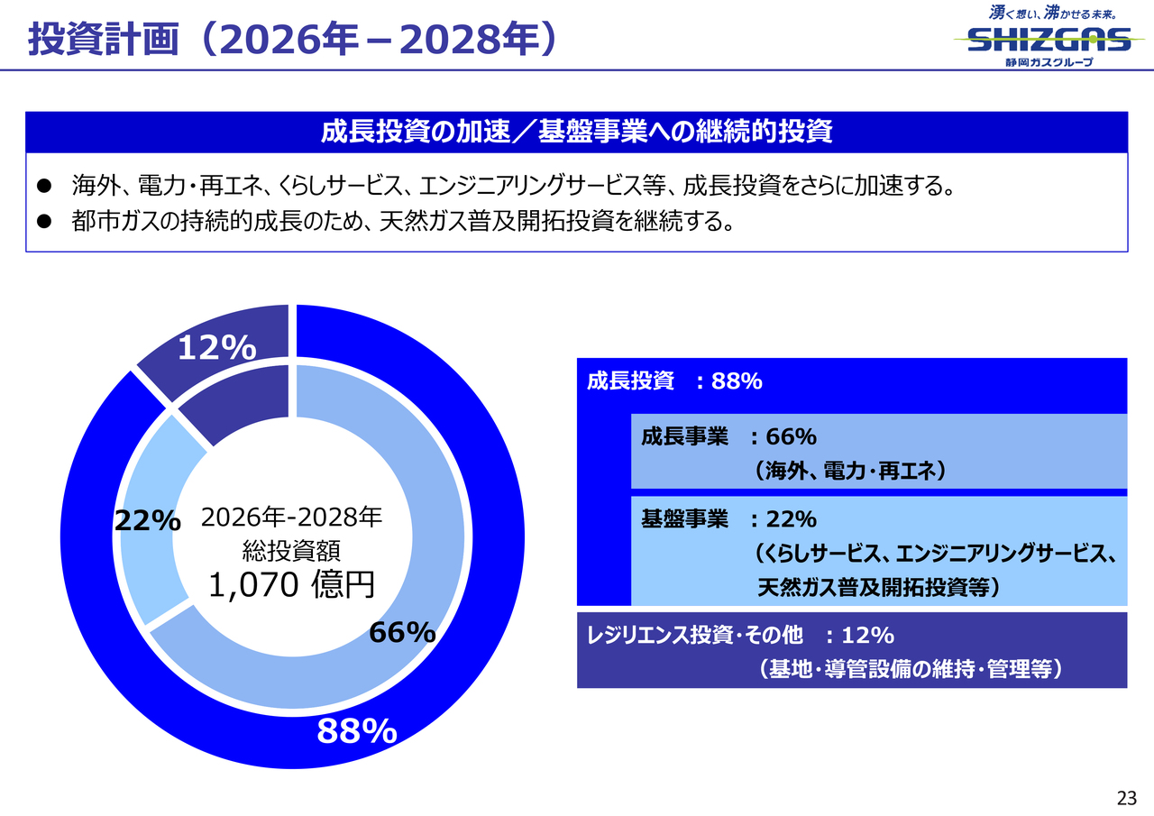 投資計画は、今後3年間で1,070億円の投資を計画しています。成長投資に88パーセント、レジリエンス投資・その他に12パーセントを割り当てる予定です。