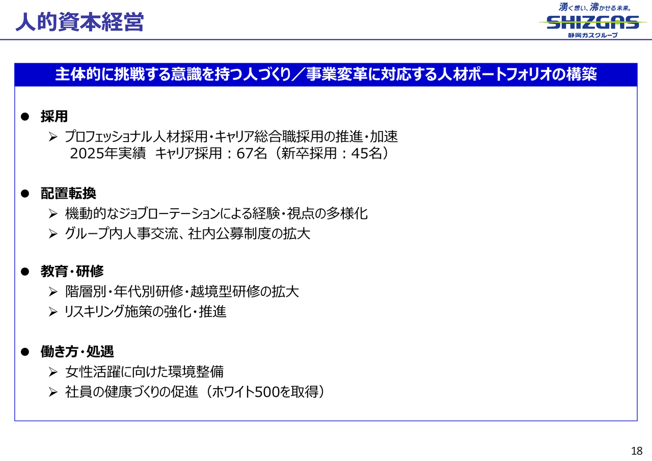 女性活躍の面では、2026年1月に管理職だった女性社員2名を、連結子会社2社の社長に任用しました。2名には会社の社長を担うことで経営を学んでいただき、状況や成長を踏まえながら、将来的には静岡ガスの執行役員への登用を検討していきたいと考えています。
