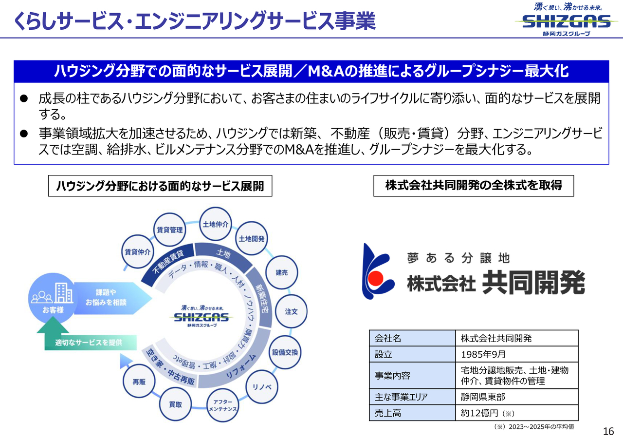 そして2月5日にリリースのとおり、静岡県東部の長泉町で不動産事業を営む共同開発を買収しました。これにより、ハウジング分野における面的なサービス展開として、不動産賃貸、土地、新築住宅、リフォーム、空き家中古再販といったラインナップが整いました。