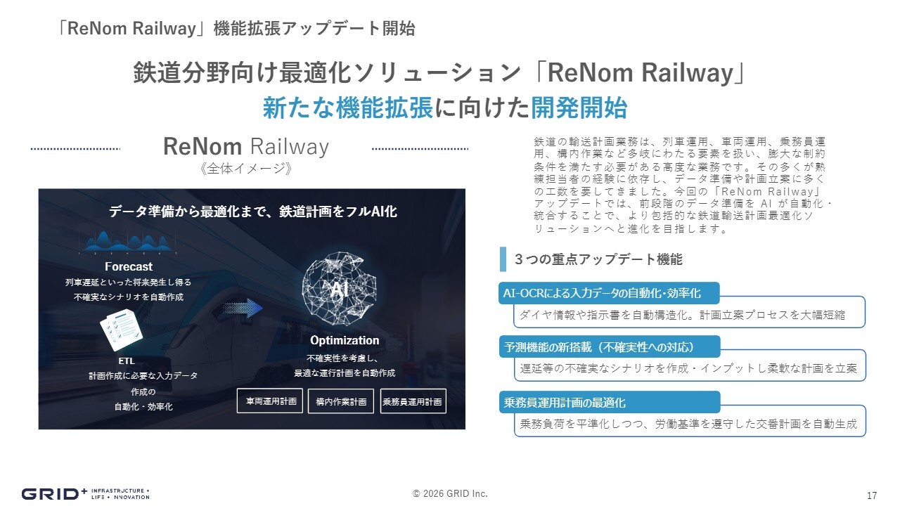 最近のトピックスをいくつかご紹介します。鉄道分野では「ReNom Railway」に新たな機能を追加する開発を開始しました。
