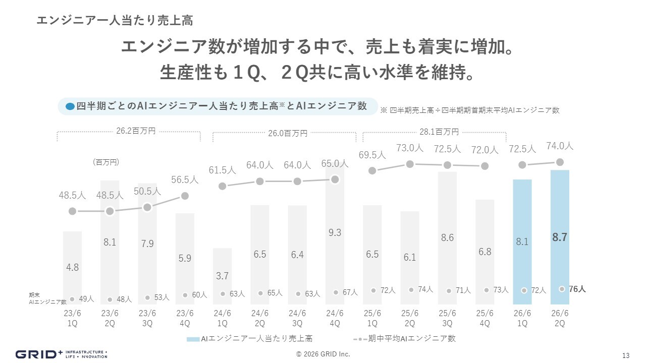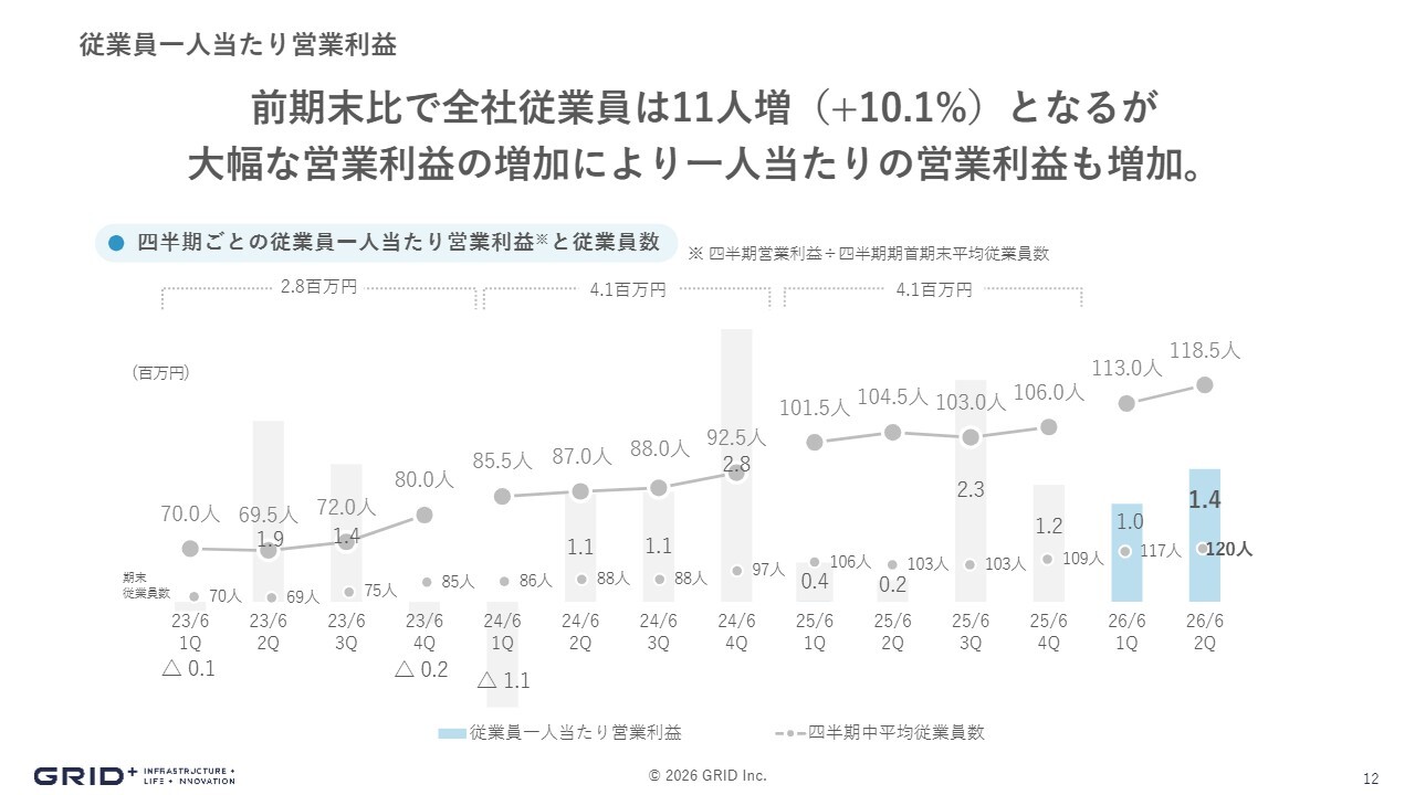 一方で、生産性は大きく減少することなく、例年どおりの数字を維持しています。会社全体の規模は拡大していますが、生産性を落とさず体制を強化している状況です。