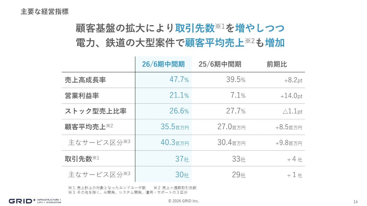 主な経営指標です。売上高成長率は47.7パーセント、営業利益率は21.1パーセント、ストック型売上比率は例年どおり26.6パーセントで推移しています。