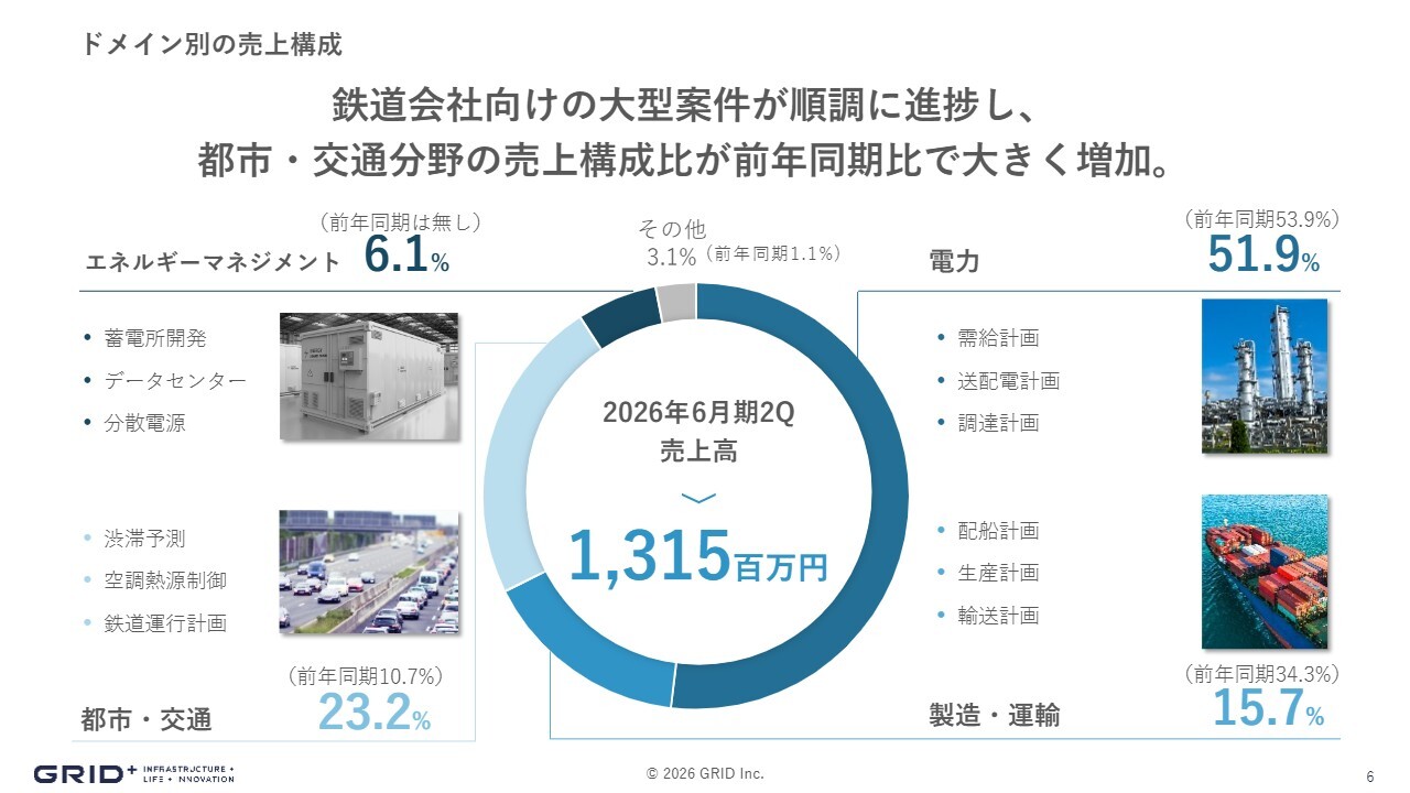 ドメイン別の売上構成をご説明します。電力領域が51.9パーセント、製造・運輸領域が15.7パーセント、都市・交通領域が23.2パーセント、新たなエネルギーマネジメント領域が上期で6.1パーセントとなりました。