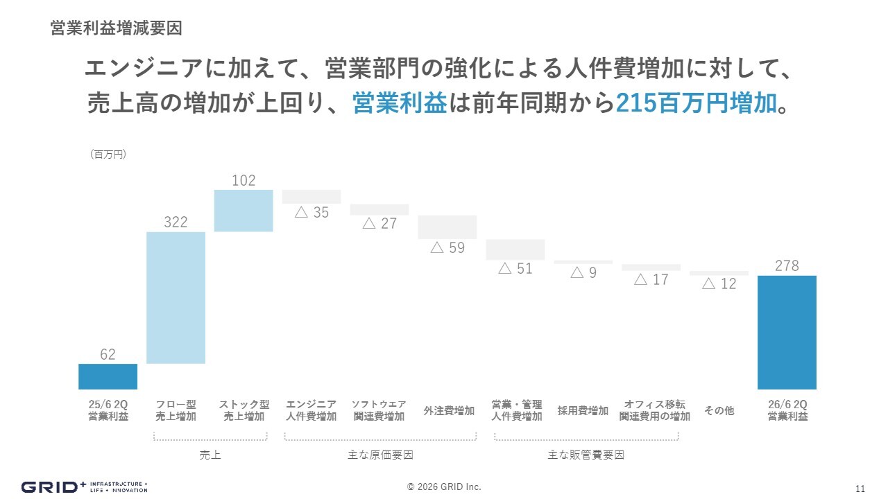 営業利益の増減要因を説明します。2025年6月期第2四半期の営業利益は6,200万円で、フロー型売上で3億2,200万円、ストック型売上で1億200万円の増加がありました。