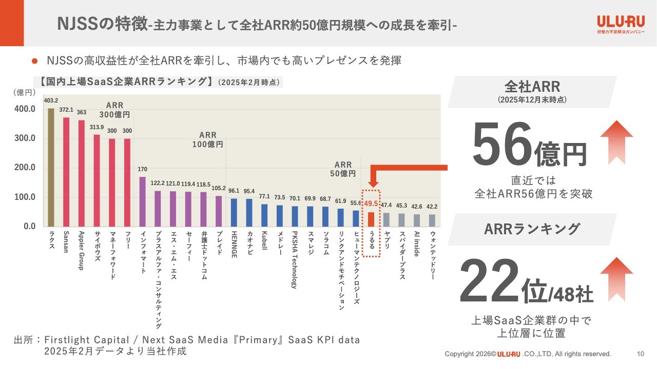 これは「NJSS」だけでなく、弊社には他にも「fondesk」などのSaaSがあります。それらも合算されていますが、うるるとしてはこれらSaaSのARRの合算で現在56億円となっており、22位にランクインしています。前後には「ヤプリ」や「ヒューマンテクノロジーズ」などの企業が位置しています。