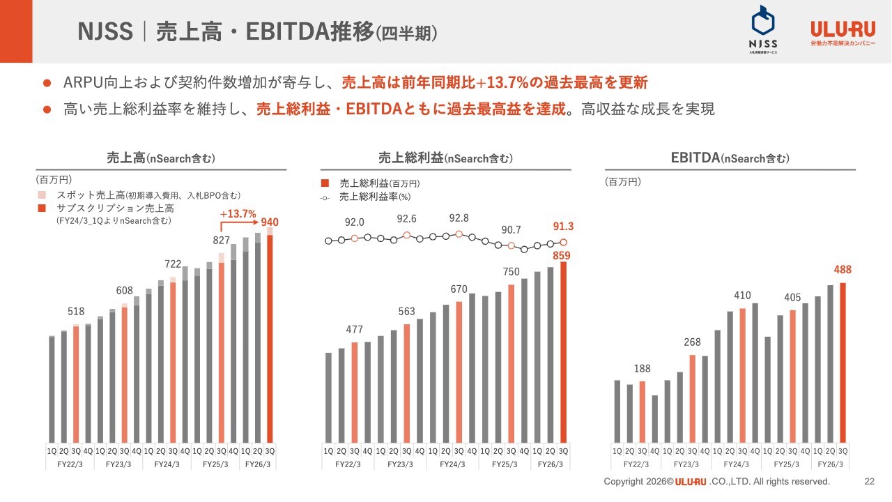 星:そのとおりです。冒頭で弊社がいくつかの事業を展開しているとお伝えし、SaaSに関しても、「NJSS」だけではなく「fondesk」があるとお話ししましたが、それ以外も含めた表になっています。「NJSS」が第3四半期終了時点で売上高が27億5,200万円、EBITDAが14億1,600万円となっています。前年同期比でもすべてプラスです。