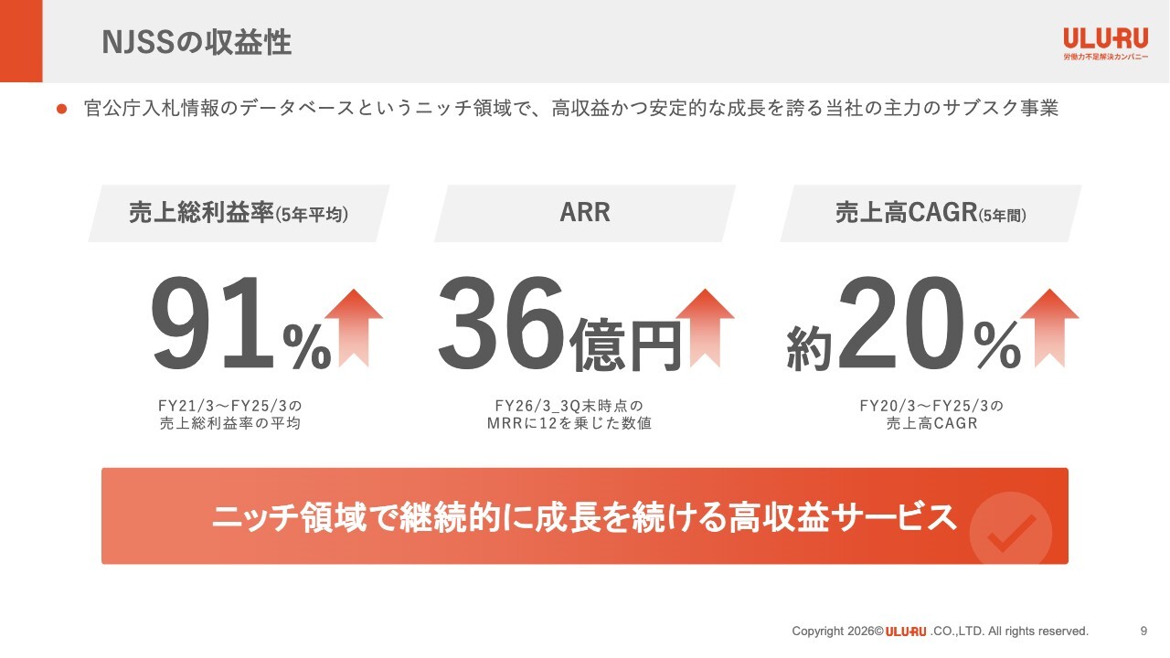 星:この「NJSS」は、情報収集にかかる部分が原価となります。情報収集コストはほぼ横ばいの推移なので、契約数が増加し売上高が増加するほど、粗利率が高まります。現在の原価率は9パーセントなので、粗利率は91パーセントとなっており、非常に利益率の高いサービスとなっています。