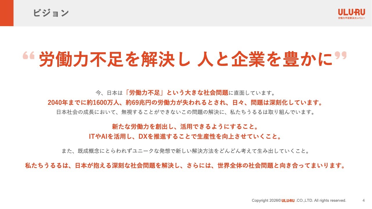日本の人口は増えるどころか、逆に減少しています。労働人口も当然ながら減少している中で、これまで労働力として認識されてこなかった人々を労働力として活用し、新たな労働力を創出していくことが、これからの社会課題に対する一つの解決の糸口になると考えました。この領域で社会課題の解決につながるサービスを提供しようという思いが、このビジョンに込められています。