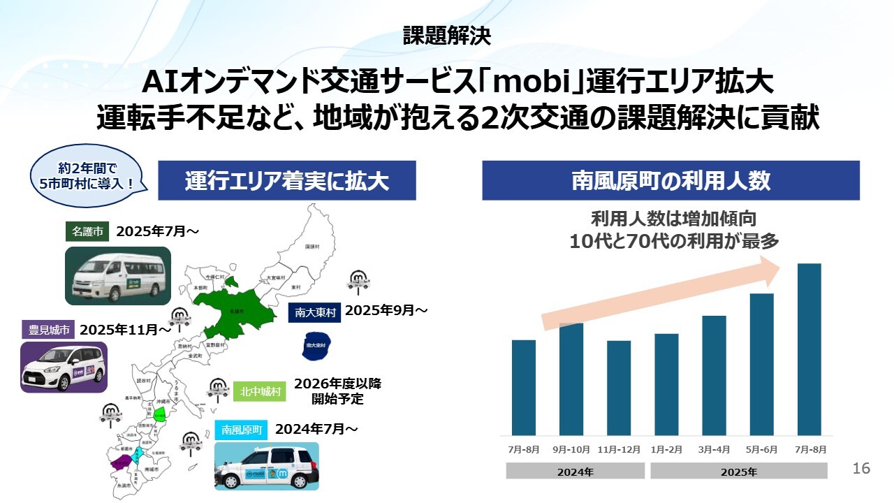 課題解決の取り組みをご紹介します。以前よりご紹介しているAIオンデマンド交通サービス「mobi」では、運行エリアが着実に拡大しています。