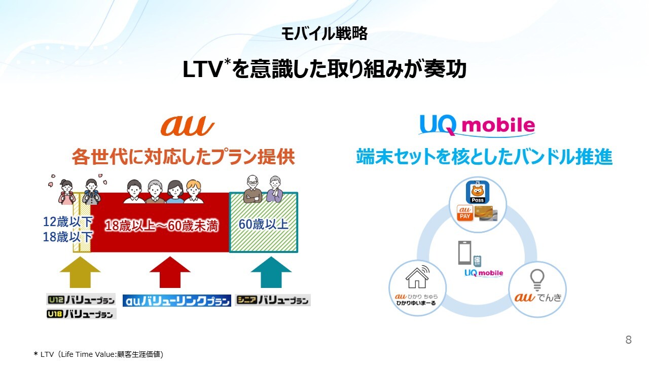 稼働構造の健全化が進展した要因については、これまでライフタイムバリュー(LTV)を意識した取り組みが功を奏していると考えています。新料金プランの価値訴求や、その後に追加投入した世代別に対応したプランの提供がお客さまから大変ご好評をいただいています。また、「UQ mobile」については、短期解約を誘発するようなSIM単体の販売を抑え、端末セットを必要とするお客さまへの販売に注力してきました。