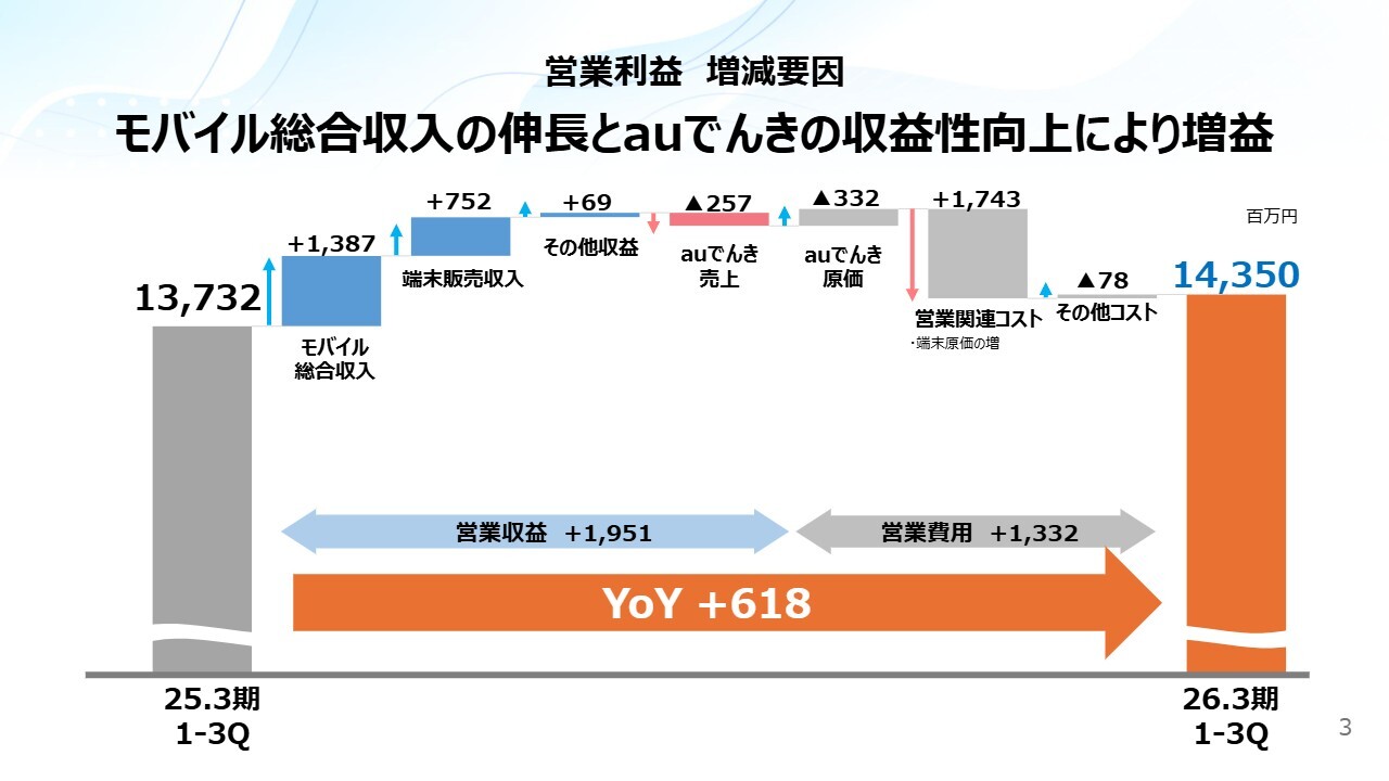 その結果、営業利益は前年比でプラス6億1,800万円の増益となりました。モバイル総合収入の増加に加え、10月からの電力小売事業参入により電気の採算が改善したことで、増益を達成できました。