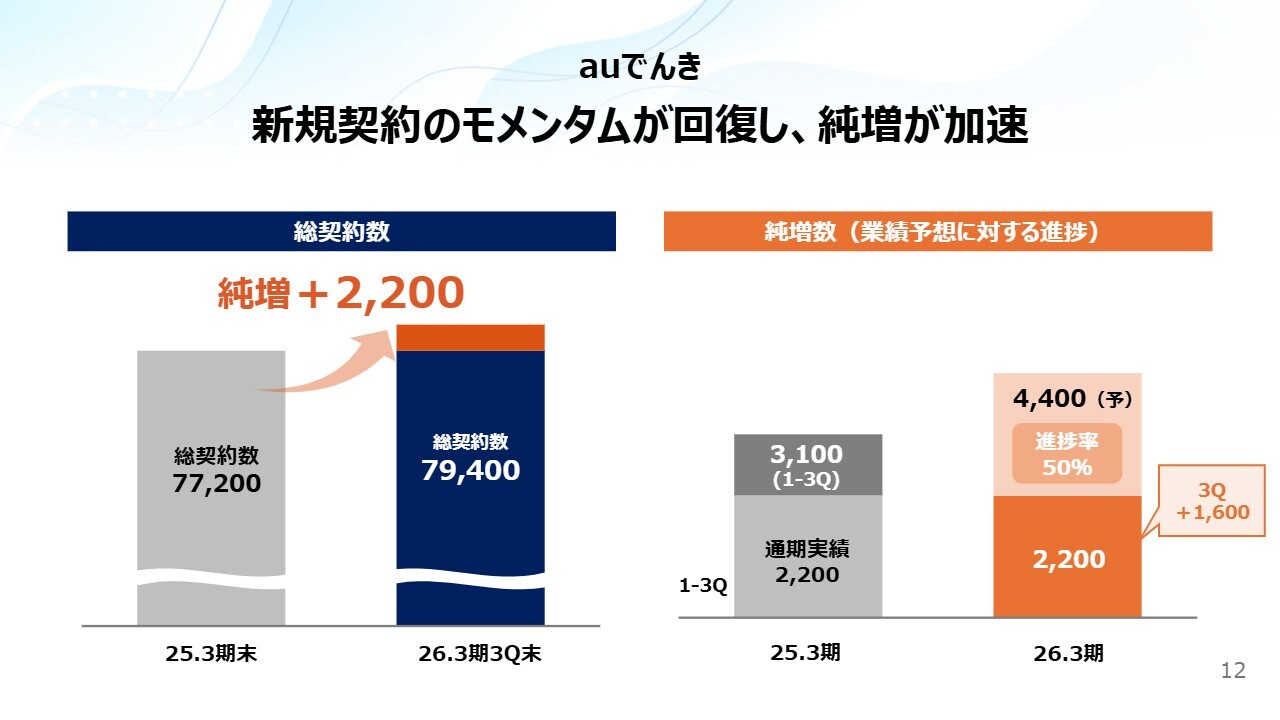 「auでんき」についての説明です。今期は2,200契約の純増となり、総契約数は7万9,400契約となりました。今期より事業採算の改善が見込まれたことから、7月に営業活動を再開し、第2四半期から純増に反転し、順調に契約数を伸ばしています。