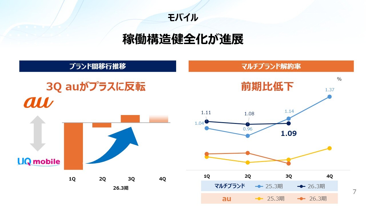 スライドは、稼働構造の健全化が進展している状況を示しています。左側はブランド間移行の状況です。第2四半期から新料金プランを導入し、「au」の魅力をしっかり訴求した結果、これまでは「au」から「UQ mobile」への移行が過多な状態が続いていましたが、この傾向から脱し、「UQ mobile」から「au」への移行や、「au」にとどまる方が増加しました。そして第3四半期には、ブランド間移行で「au」がプラスに転じるようになりました。